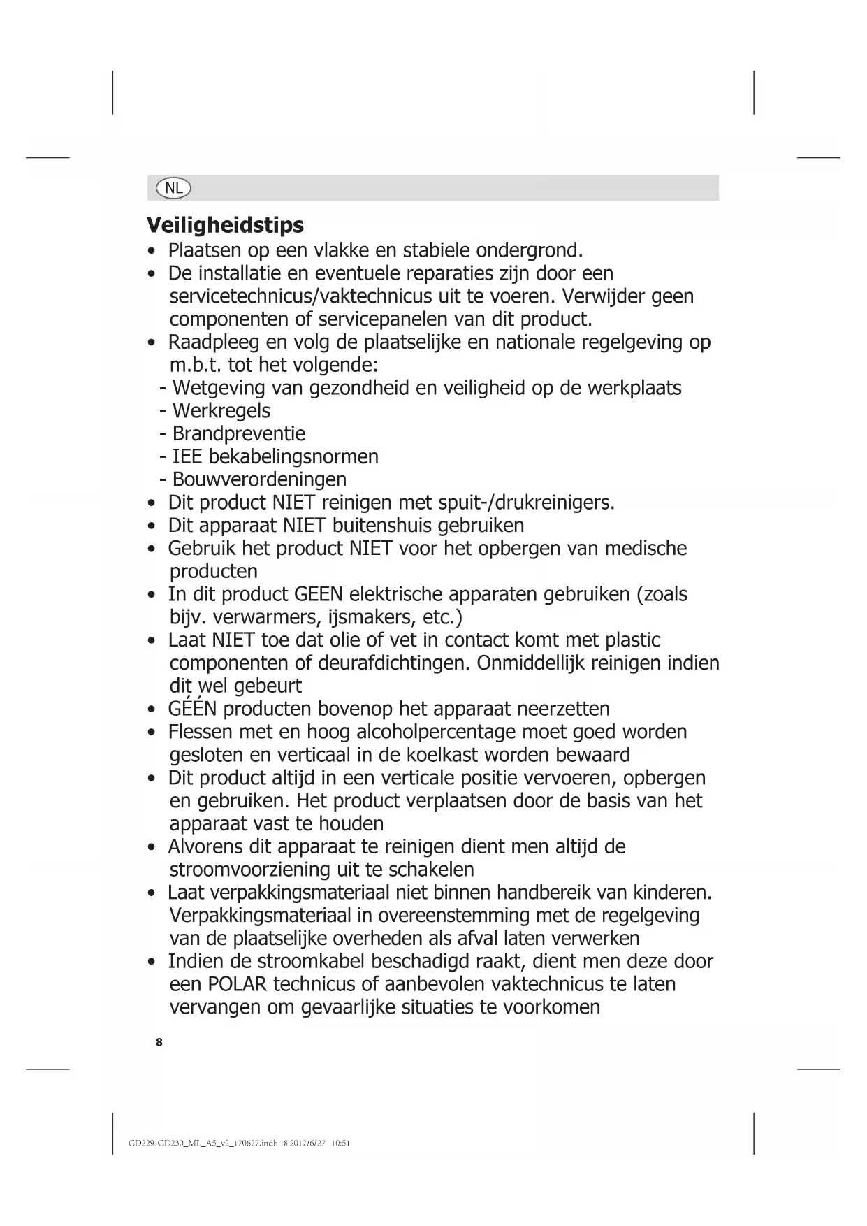 - Indien de stroomkabel beschadigd raakt, dient men deze door een POLAR technicus of aanbevolen vaktechnicus te laten vervangen om gevaarlijke situaties te voorkomen CD229-CD230_ML_A5_v2_170627.indb 8 2017/6/27 10:519