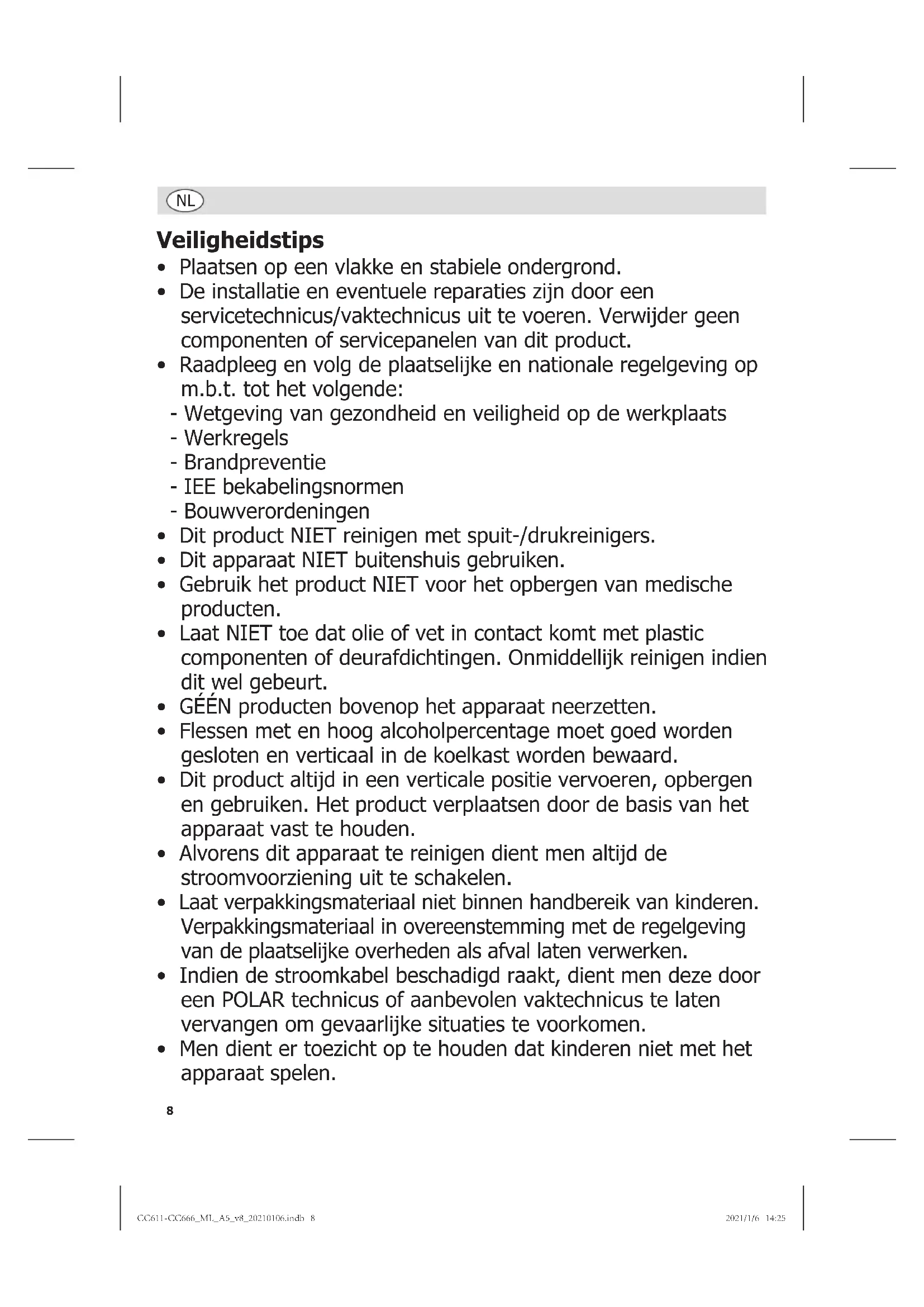- Indien de stroomkabel beschadigd raakt, dient men deze dooreen POLAR technicus of aanbevolen vaktechnicus te latenvervangen om gevaarlijke situatuies te voorkomen.
