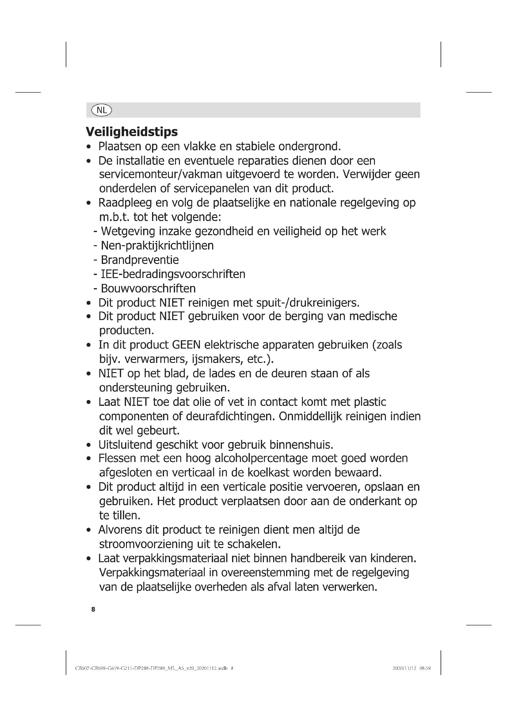- Laat verpakkingsmateriaal niet binnen handbereik van kinderen. Verpakkingsmateriaal in overeenstemming met de regelgeving van de plaatselijke overheden als afval laten verwerken. CB507-CB509-G619-G211-DP288-DP289_ML_A5_v20_20201112.indb 8CB507-CB509-G619-G211-DP288-DP289_ML_A5_v20_20201112.indb 8 2020/11/12 08:592020/11/12 08:599