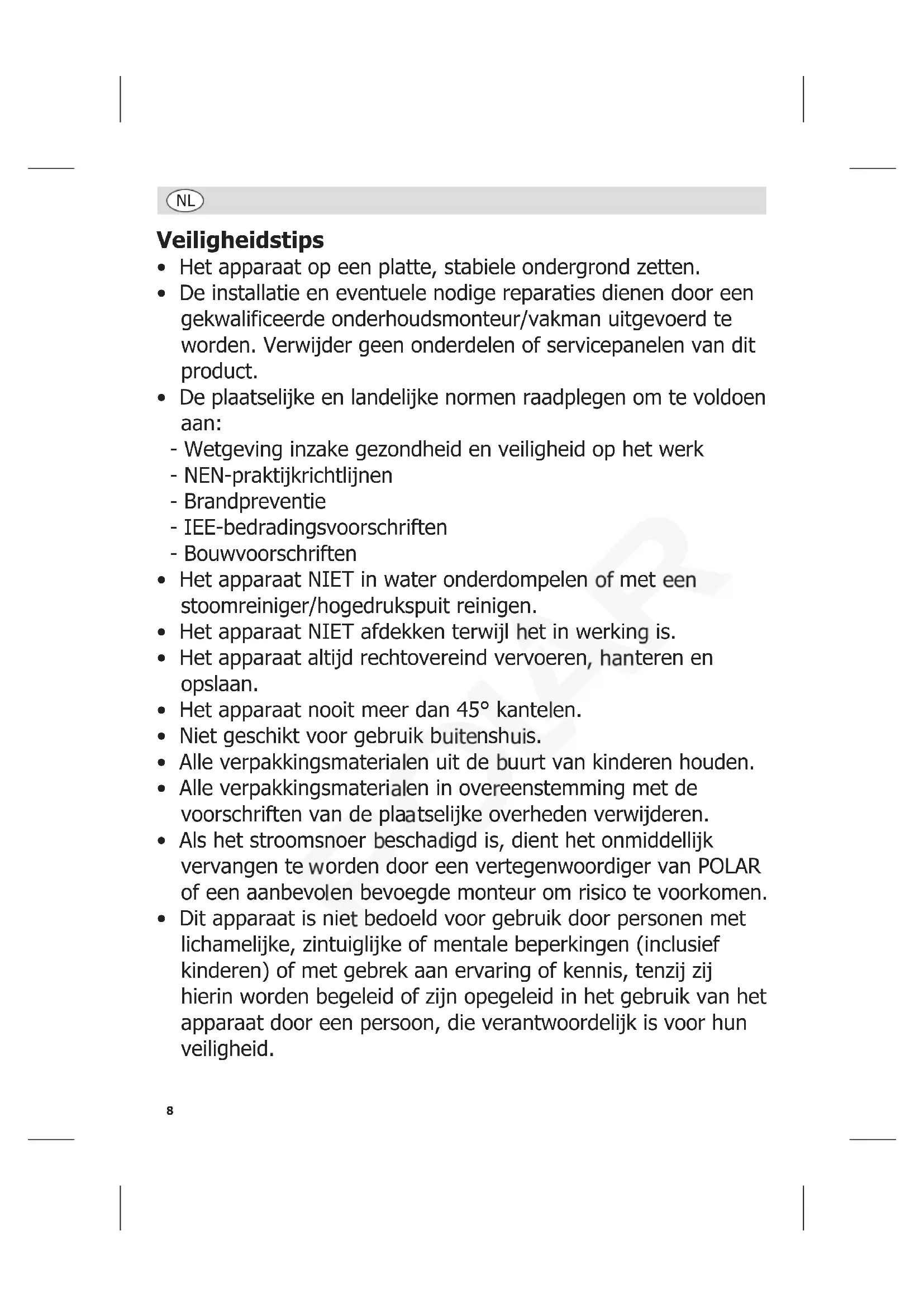 - Eventuele reparaties dienen door een vertegenwoordiger van POLAR of een bevoegde monteur uitgevoerd te worden.
