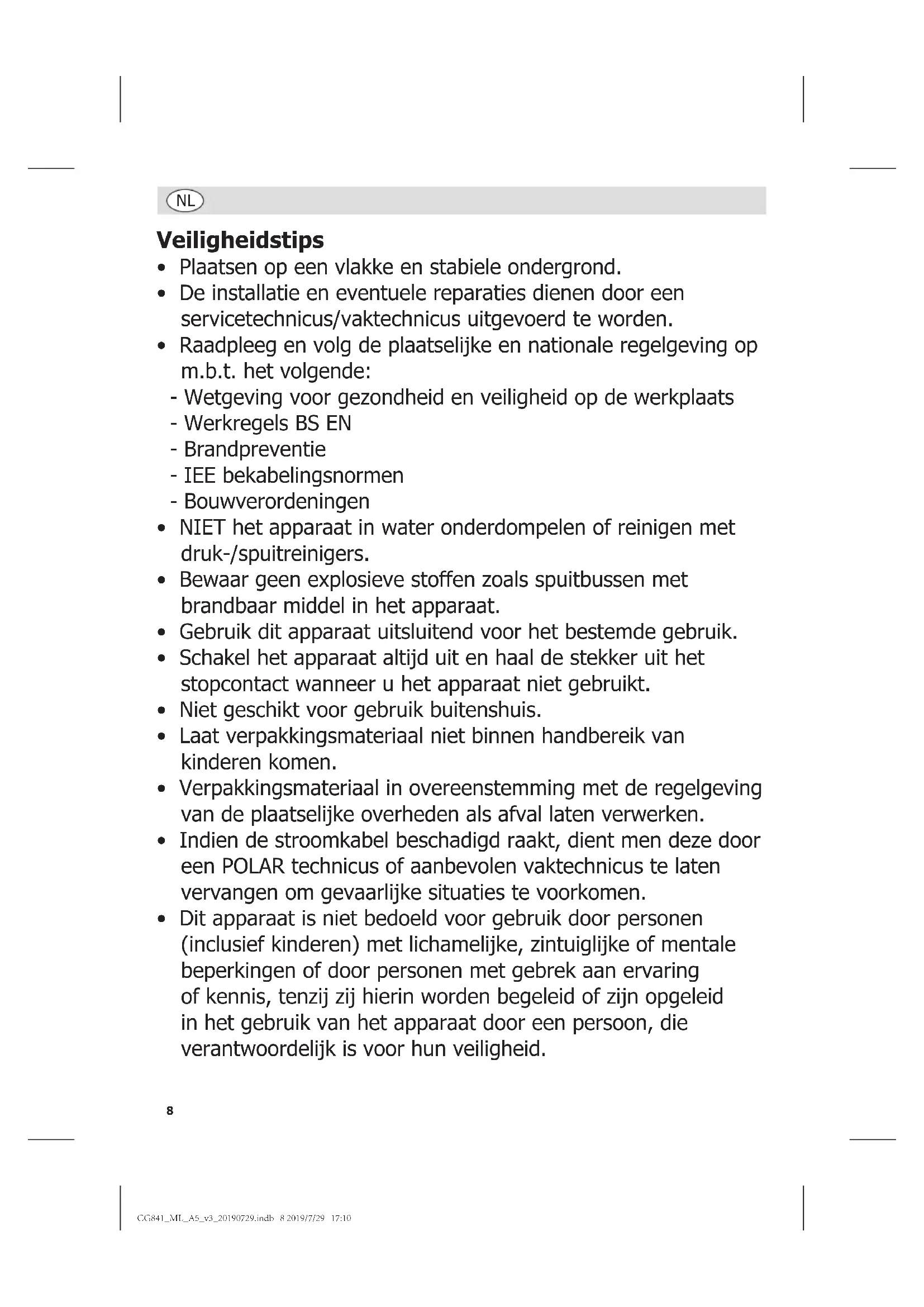 - Dit apparaat is niet bedoeld voor gebruik door personen (inclusief kinderen) met lichamelijke, zintuiglijke of mentale beperkingen of door personen met gebrek aan ervaring of kennis, tenzij zij hierin worden begeleid of zijn opgeleid in het gebruik van het apparaat door een persoon, die verantwoordelijk is voor hun veiligheid. CG841_ML_A5_v3_20190729.indb 8 2019/7/29 17:109