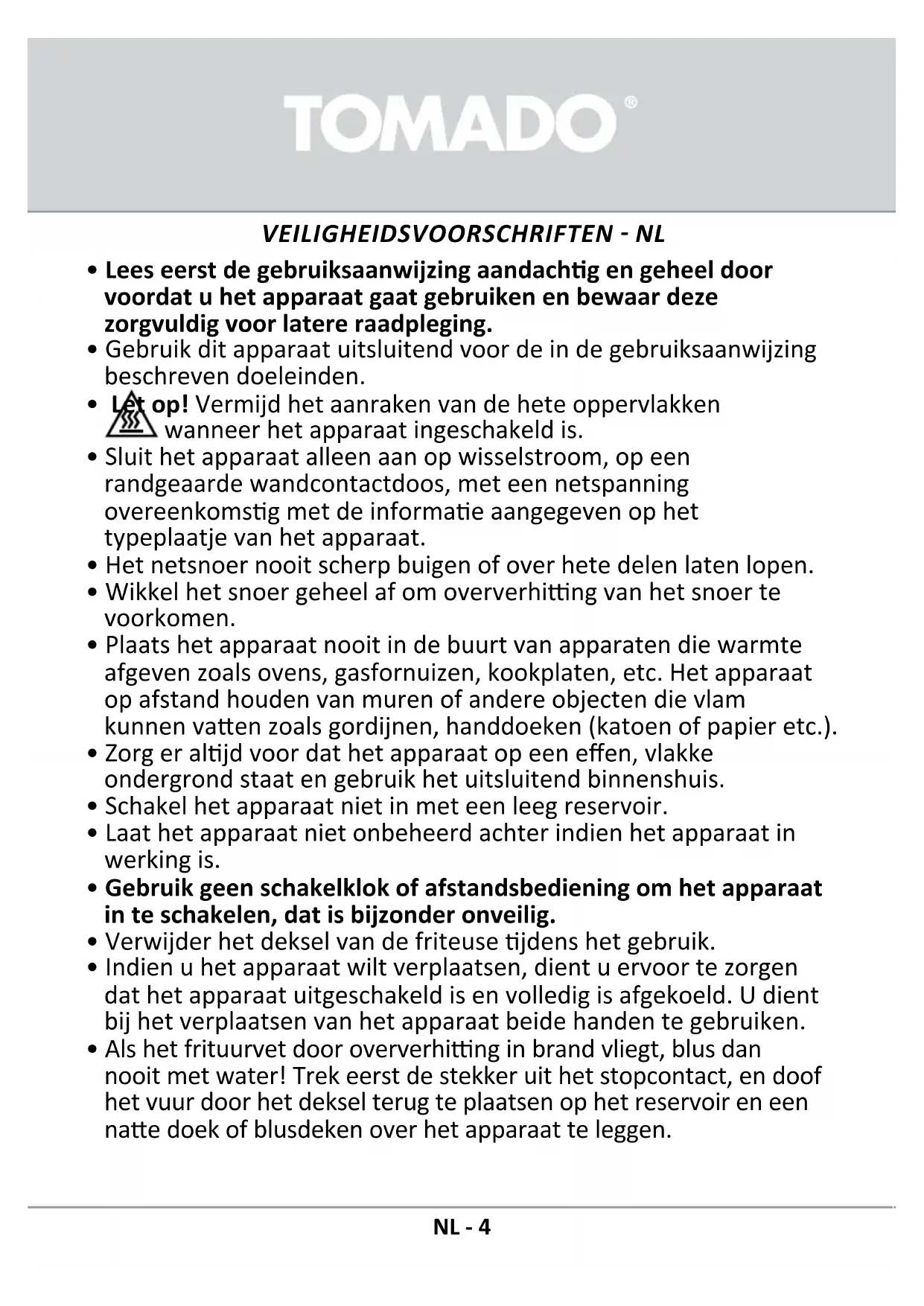 NL - 4• Gebruik het apparaat niet wanneer de stekker, het snoer of het apparaat beschadigd is, of wanneer het apparaat niet meer naar behoren funconeert of wanneer het gevallen of op een andere manier beschadigd is. Raadpleeg dan de winkelier of onze technische dienst. In geen geval de stekker of het snoer zelf vervangen. Reparaes aan elektrische apparaten dienen uitsluitend door vakmensen uitgevoerd te worden.