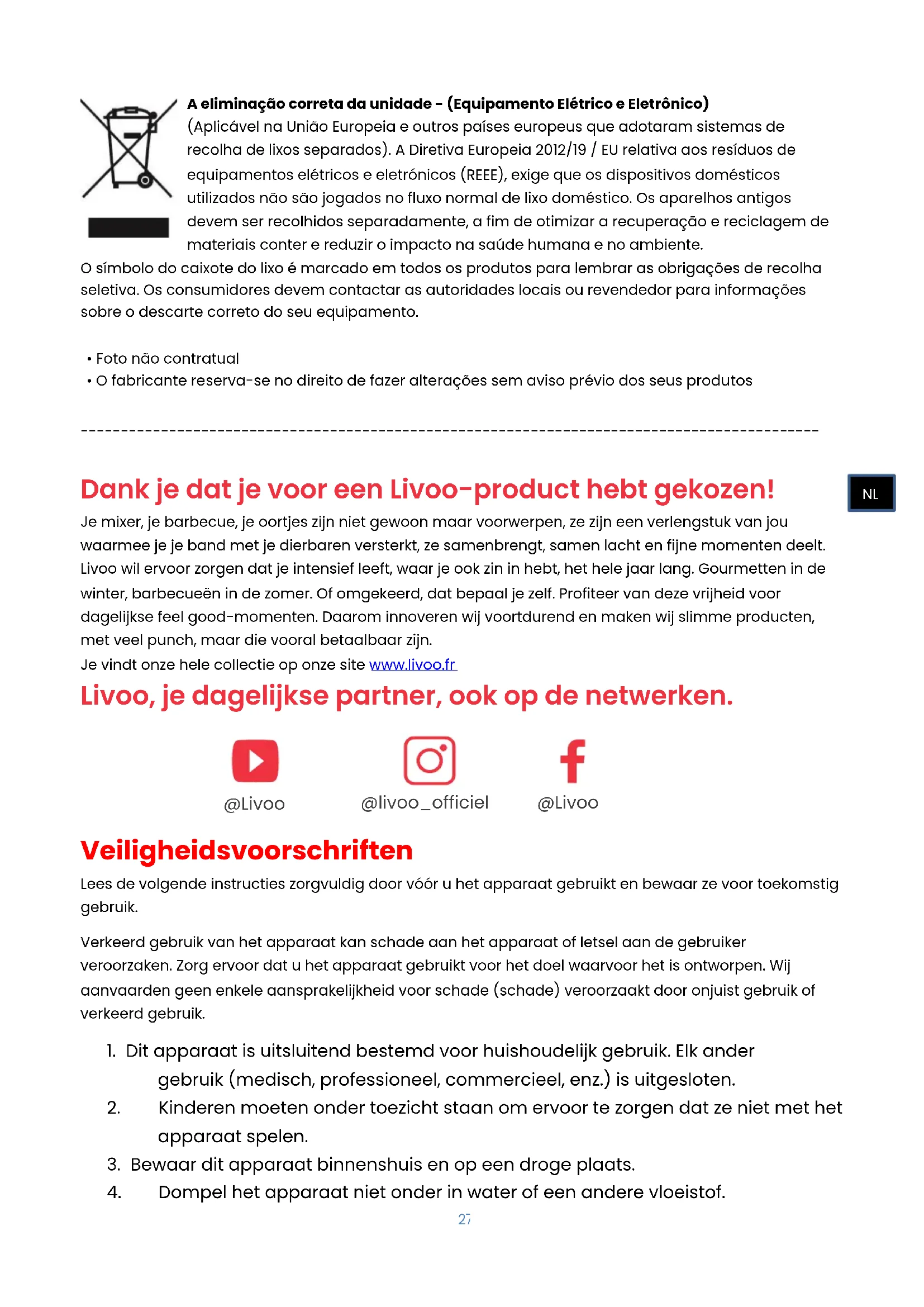 Dank je dat je voor een Livoo-product hebt gekozen! Je mixer, je barbecue, je oortjes zijn niet gewoon maar voorwerpen, ze zijn een verlengstuk van jou waarmee je je band met je dierbaren versterkt, ze samenbrengt, samen lacht en fijne momenten deelt. Livoo wil ervoor zorgen dat je intensief leeft, waar je ook zin in hebt, het hele jaar lang. Gourmetten in de winter, barbecueën in de zomer. Of omgekeerd, dat bepaal je zelf. Profiteer van deze vrijheid voor dagelijkse feel good-momenten. Daarom innoveren wij voortdurend en maken wij slimme producten, met veel punch, maar die vooral betaalbaar zijn. Je vindt onze hele collectie op onze site www.livoo.fr Livoo, je dagelijkse partner, ook op de netwerken.