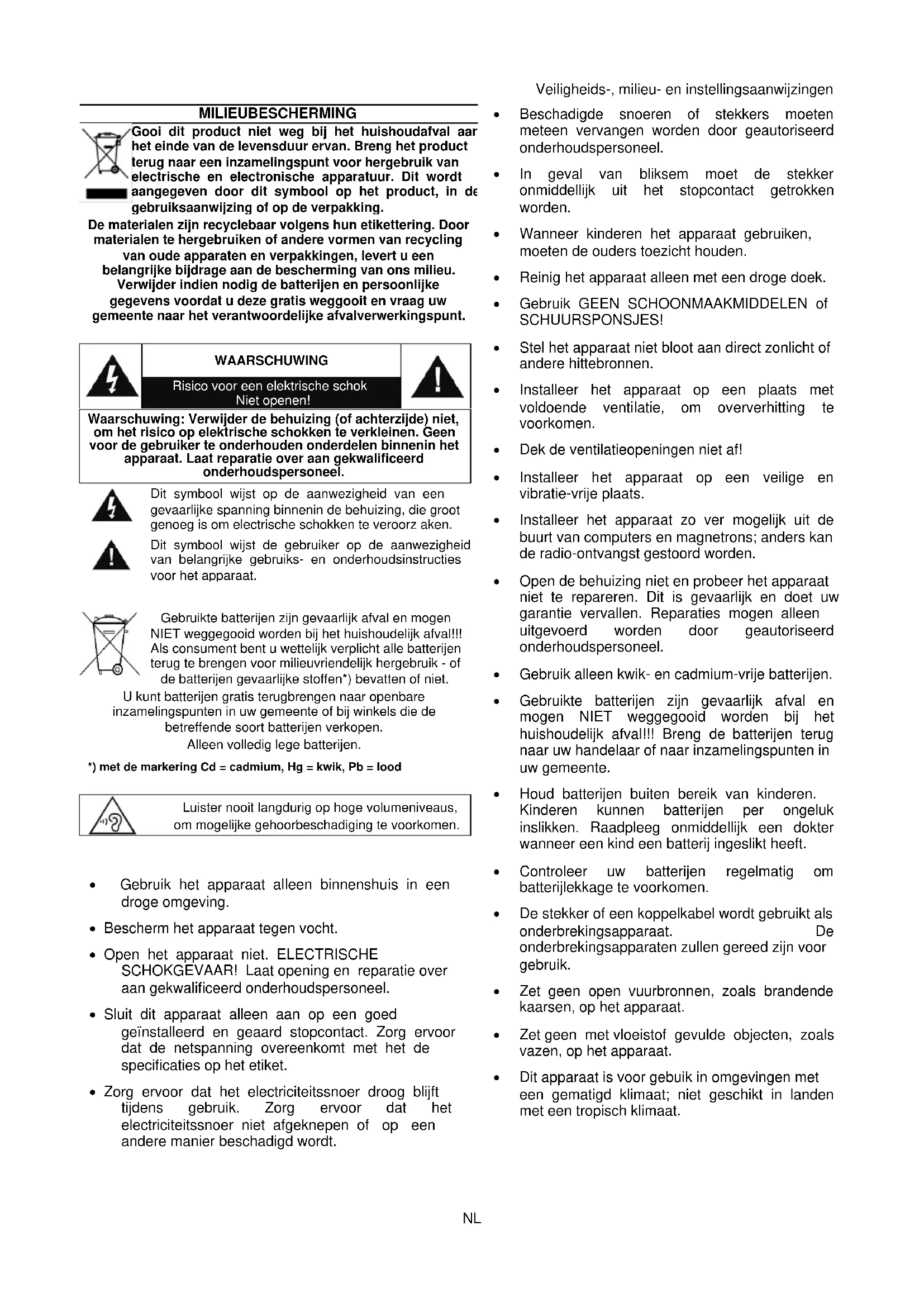 - Gebruikte batterijen zijn gevaarlijk afval en mogen NIET weggegooid worden bij het huishoudelijk afval!!! Breng de batterijen terug naar uw handelaar of naar inzamelingspunten in uw gemeente.