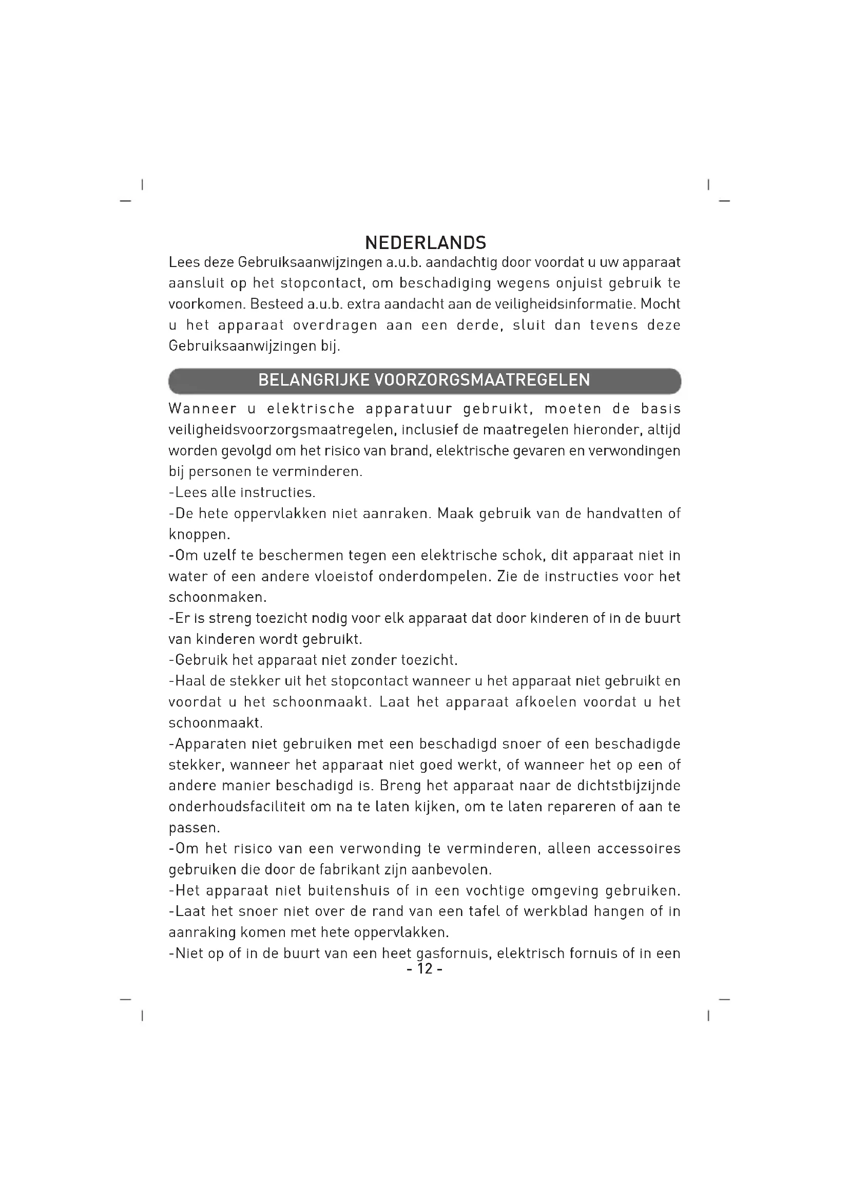 Nos appareils sont soumis à un strict contrôle de qualité avant d’être livrés. Si malgré toute diligence pendant la production ou lors du transport, des endommagements se sont présentés, retournez l'appareil au revendeur. En plus des droits légaux, l'acheteur peut recourir à la garantie sous les conditions suivantes : Nous offrons une garantie de 2 ans pour l’appareil acheté à compter du jour de l'achat. Pendant cette période, nous réparons ou remplaçons gratuitement tous les défauts de matériel et de production. La garantie ne couvre pas les dommages pouvant être attribués à une manipulation incorrecte de l’appareil ou à des dysfonctionnements causés par l’intervention de personnes non qualifiées ou encore au montage de pièces qui ne seraient pas des pièces d'origine.- 12 - NEDERLANDS Lees deze Gebruiksaanwijzingen a.u.b. aandachtig door voordat u uw apparaat aansluit op het stopcontact, om beschadiging wegens onjuist gebruik te voorkomen. Besteed a.u.b. extra aandacht aan de veiligheidsinformatie. Mocht u het apparaat overdragen aan een derde, sluit dan tevens deze Gebruiksaanwijzingen bij. Wanneer u elektrische apparatuur gebruikt, moeten de basis veiligheidsvoorzorgsmaatregelen, inclusief de maatregelen hieronder, altijd worden gevolgd om het risico van brand, elektrische gevaren en verwondingen bij personen te verminderen. -Lees alle instructies. -De hete oppervlakken niet aanraken. Maak gebruik van de handvatten of knoppen. -Om uzelf te beschermen tegen een elektrische schok, dit apparaat niet in water of een andere vloeistof onderdompelen. Zie de instructies voor het schoonmaken. -Er is streng toezicht nodig voor elk apparaat dat door kinderen of in de buurt van kinderen wordt gebruikt. -Gebruik het apparaat niet zonder toezicht. -Haal de stekker uit het stopcontact wanneer u het apparaat niet gebruikt en voordat u het schoonmaakt. Laat het apparaat afkoelen voordat u het schoonmaakt. -Apparaten niet gebruiken met een beschadigd snoer of een beschadigde stekker, wanneer het apparaat niet goed werkt, of wanneer het op een of andere manier beschadigd is. Breng het apparaat naar de dichtstbijzijnde onderhoudsfaciliteit om na te laten kijken, om te laten repareren of aan te passen. -Om het risico van een verwonding te verminderen, alleen accessoires gebruiken die door de fabrikant zijn aanbevolen. -Het apparaat niet buitenshuis of in een vochtige omgeving gebruiken. -Laat het snoer niet over de rand van een tafel of werkblad hangen of in aanraking komen met hete oppervlakken. -Niet op of in de buurt van een heet gasfornuis, elektrisch fornuis of in een BELANGRIJKE VOORZORGSMAATREGELEN- 13 - verwarmde oven plaatsen. -Extreme voorzichtigheid is geboden wanneer u een kop hete vloeistof uit dit apparaat haalt. -Gebruik het apparaat alleen waarvoor het bedoeld is. BELANGRIJKE VOORZORGSMAATREGELEN TECHNISCHE GEGEVENS Werkingsvoltage : 230V~, 50Hz Stroomverbruik : 350W Kooktijd : 8-12 minuut EIGENSCHAPPEN