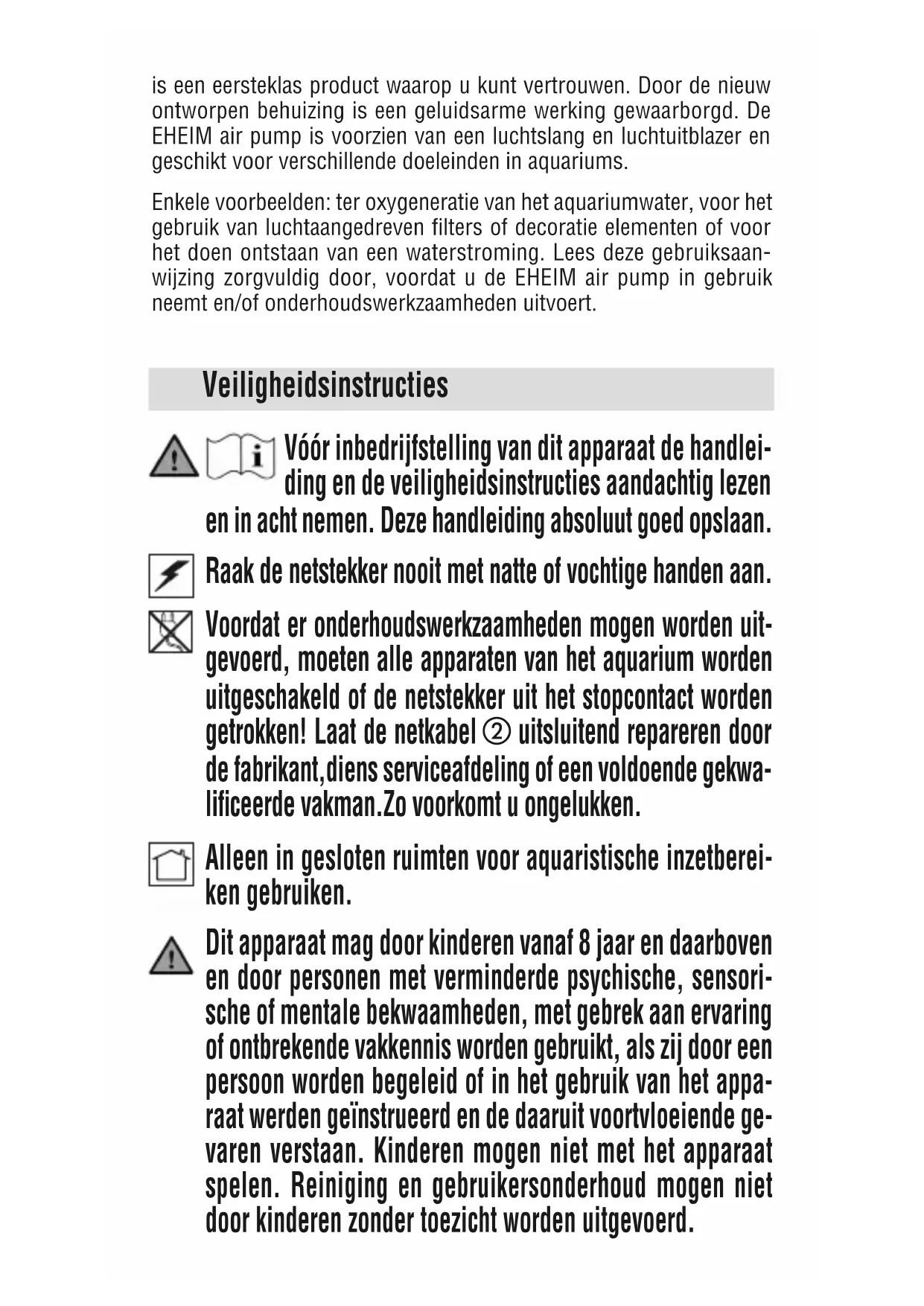 uitsluitend repareren door de fabrikant,diens serviceafdeling of een voldoende gekwa- lificeerde vakman.Zo voorkomt u ongelukken. Alleen in gesloten ruimten voor aquaristische inzetberei- ken gebruiken. Dit apparaat mag door kinderen vanaf 8 jaar en daarboven en door personen met verminderde psychische, sensori- sche of mentale bekwaamheden, met gebrek aan ervaring of ontbrekende vakkennis worden gebruikt, als zij door een persoon worden begeleid of in het gebruik van het appa- raat werden geïnstrueerd en de daaruit voortvloeiende ge- varen verstaan. Kinderen mogen niet met het apparaat spelen. Reiniging en gebruikersonderhoud mogen niet door kinderen zonder toezicht worden uitgevoerd.