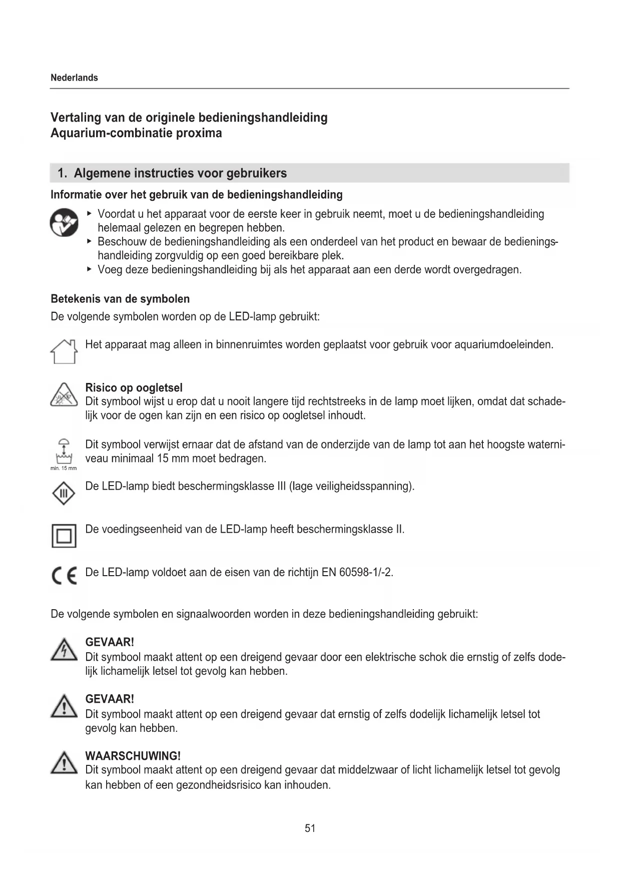 handleiding zorgvuldig op een goed bereikbare plek. ▶ Voeg deze bedieningshandleiding bij als het apparaat aan een derde wordt overgedragen. Betekenis van de symbolen De volgende symbolen worden op de LED-lamp gebruikt: Het apparaat mag alleen in binnenruimtes worden geplaatst voor gebruik voor aquariumdoeleinden. Risico op oogletsel Dit symbool wijst u erop dat u nooit langere tijd rechtstreeks in de lamp moet lijken, omdat dat schade- lijk voor de ogen kan zijn en een risico op oogletsel inhoudt. Dit symbool verwijst ernaar dat de afstand van de onderzijde van de lamp tot aan het hoogste waterni