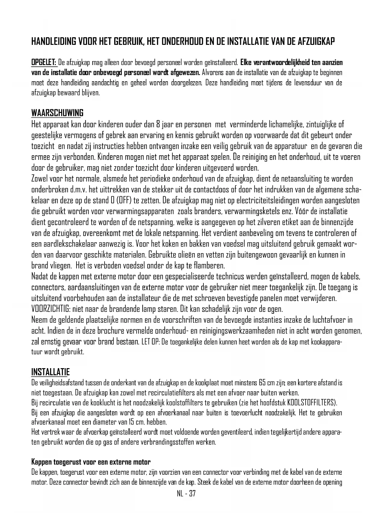 Avant d’effectuer toute intervention de nettoyage et de maintenance, couper l’alimentation de la hotte en mettant l'interrupteur général en position 0 (OFF). Remplacement des lampes Spot à led : Le spot ne doit être remplacé que par des techniciens qualifiés et uniquement en utilisant des pièces de rechange originales. Nettoyage des filtres métalliques Les filtres métalliques en dotation avec la hotte doivent être lavés tous les 2-3 mois en fonction de l'intensité d’utilisation, avec de l’eau chaude et du détergent liquide non agressif. Les filtres métalliques doivent être enlevés en utilisant la poignée spéciale en décrochant en premier le filtre dans la partie avant en le tirant vers le bas (Fig. 5). Filtres au carbone Si la hotte est utilisée avec système filtrant avec recyclage interne, il est nécessaire d’employer des filtres au carbone qui contiennent du carbone actif. Le carbone actif contenu dans les filtres, sert à retenir les odeurs des fumées de cuisine. Pour l’enlèvement et le remplacement des filtres faire réf. à la fig. 6 Les filtres au carbone en POLYESTER ne peuvent pas être régénérés ou lavés et doivent être remplacés périodiquement (tous les 4 mois si on utilise la hotte pendant deux heures par jour). Les filtres saturés de graisses peuvent en effet être cause d’in- cendies. Sur la base du modèle de hotte, les filtres au carbone peuvent être de forme circulaire ou bien rectangulaire. Le filtre à charbon LONG LIFE peut être nettoyé et reutilize. Le filtre doit être nettoyé tous les deux mois en utilization normale. II est recommandé de nettoyer le filtre dans un lave-vaisselle, à la température maximum ; utiliser un détergent normal. Aucun ustensile ménager ne doit être présent dans le lave – vaisselle lors du nettoyage du filtre, afin d’éviter tout dépôt de particules d’aliments qui risqueraient de causer ultérieurement de mauvaises odeurs. Pour réactiver le charbon, il suffit de mettre le filtre à sacher au four. Régler le four sur chaleur normale (pas sur “Gril”), à une temperature maximum de 100 °, et y laisser le filtre pendant 10 minutes. Le filtre doit être remplacé quand il n’est plus en mesure d’absorber de façon satisfaisante les odeurs de cuisson. (fig. 7) Condensation dans la hotte Les plaques à induction ou vitrocéramique réchauffent la nourriture très rapidement en produisant de la vapeur avec la cuis- son avant que la surface en verre ou en acier de la hotte ne se soit réchauffée. Ce qui provoque de la condensation sur la hotte avec comme conséquence la formation de gouttes d’eau. Une autre cause de la condensation pourrait être le fait que le conduit de sortie des fumées ne correspond pas aux dimensions que nous avons conseillé (voir paragraphe INSTALLATION). La vapeur qui reste dans la hotte pendant le refroidissement se condense en produisant des gouttes d’eau. Il est conseillé d'allumer la hotte dix minutes avant de commencer à cuisiner et, après avoir terminé, de la laisser allumée pour que toutes les fumées qui se sont accumulées dans le conduit puissent s’échapper. En outre il est très important de nettoyer régulièrement les filtres et, en cas de détérioration, de les remplacer (voir NETTOYA- GE des FILTRES MÉTALLIQUES). Nettoyage de la hotte Le nettoyage périodique des surfaces permet d'éviter de devoir par la suite éliminer avec beaucoup de difficulté des dépôts de salissures incrustées. Si la hotte est peinte ou cuivrée, utiliser un chiffon souple avec de l’eau tiède et un détergent neutre. Il est interdit de verser des liquides directement sur la hotte et d’utiliser des produits granuleux et/ou abrasifs. Si la hotte est en acier inox, utiliser des produits et des chiffons spéciaux pour l’acier inox satiné (non abrasifs et/ou corrosifs et sans chlore), en ayant soin de suivre avec le chiffon le sens du satinage. Ne pas utiliser de produits agressifs, dissolvants chimiques ou dérivés de distillats de pétrole qui pourraient laisser des résidus huileux susceptibles d’oxydation et de polymérisation. Hamlet - Romeo: Lorsque vous utilisez de l'huile pour cuire il se répandra dans la partie inférieure de la hotte, et donc cet endroit doit être nettoyé plus souvent que d'habitude. La firme constructrice ne répond pas de dommages esthétiques causés par la non observation des indica- tions énumérées ci-dessus.NL - 37 HANDLEIDING VOOR HET GEBRUIK, HET ONDERHOUD EN DE INSTALLATIE VAN DE AFZUIGKAP OPGELET: De afzuigkap mag alleen door bevoegd personeel worden geïnstalleerd. Elke verantwoordelijkheid ten aanzien van de installatie door onbevoegd personeel wordt afgewezen. Alvorens aan de installatie van de afzuigkap te beginnen moet deze handleiding aandachtig en geheel worden doorgelezen. Deze handleiding moet tijdens de levensduur van de afzuigkap bewaard blijven. WAARSCHUWING Het apparaat kan door kinderen ouder dan 8 jaar en personen met verminderde lichamelijke, zintuiglijke of geestelijke vermogens of gebrek aan ervaring en kennis gebruikt worden op voorwaarde dat dit gebeurt onder toezicht en nadat zij instructies hebben ontvangen inzake een veilig gebruik van de apparatuur en de gevaren die ermee zijn verbonden. Kinderen mogen niet met het apparaat spelen. De reiniging en het onderhoud, uit te voeren door de gebruiker, mag niet zonder toezicht door kinderen uitgevoerd worden. Zowel voor het normale, alsmede het periodieke onderhoud van de afzuigkap, dient de netaansluiting te worden onderbroken d.m.v. het uittrekken van de stekker uit de contactdoos of door het indrukken van de algemene scha- kelaar en deze op de stand 0 (OFF) te zetten. De afzuigkap mag niet op electriciteitsleidingen worden aangesloten die gebruikt worden voor verwarmingsapparaten zoals branders, verwarmingsketels enz. Vóór de installatie dient gecontroleerd te worden of de netspanning, welke is aangegeven op het zilveren etik
