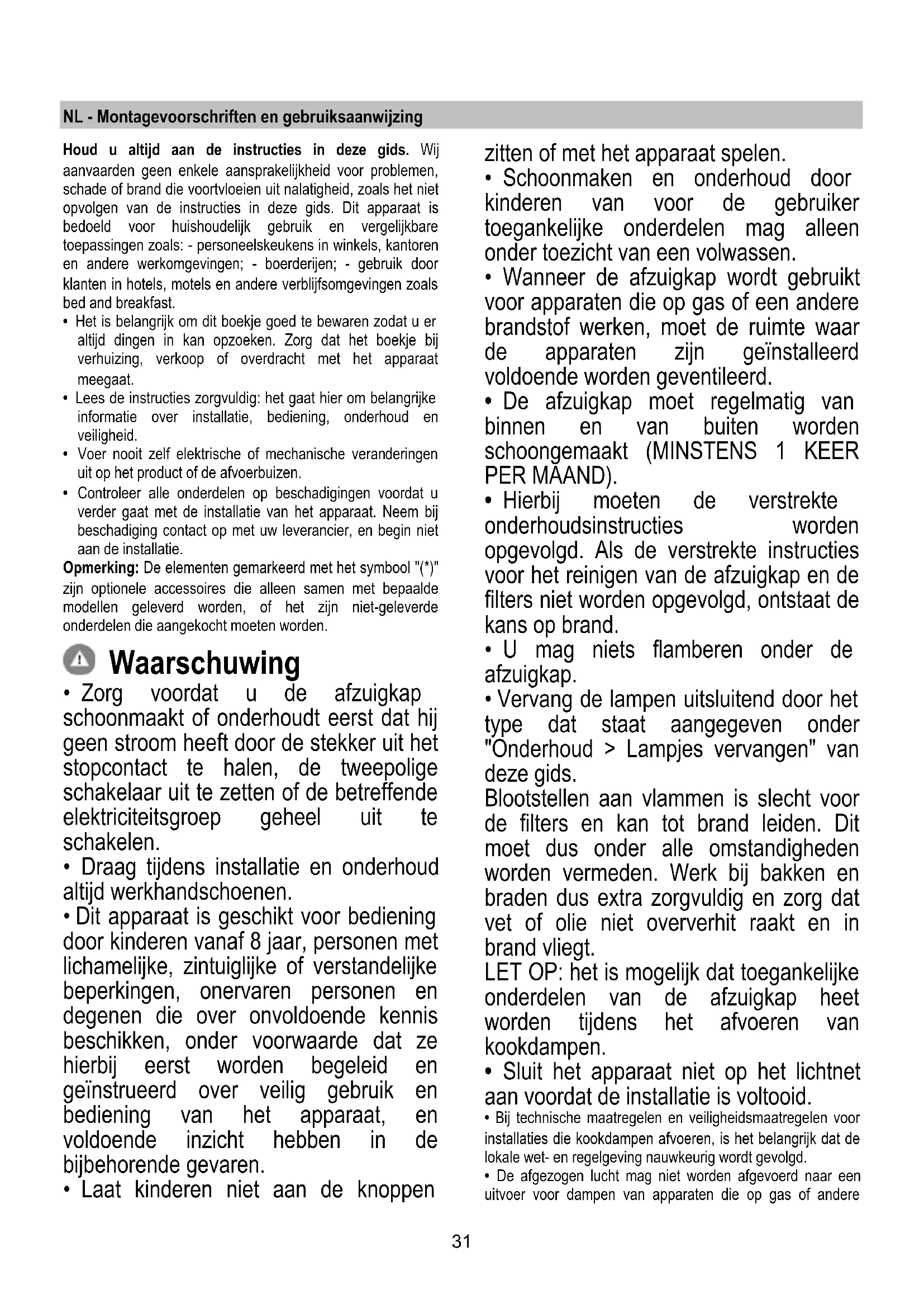 - De afzuigkap moet regelmatig van binnen en van buiten worden schoongemaakt (MINSTENS 1 KEER PER MAAND).