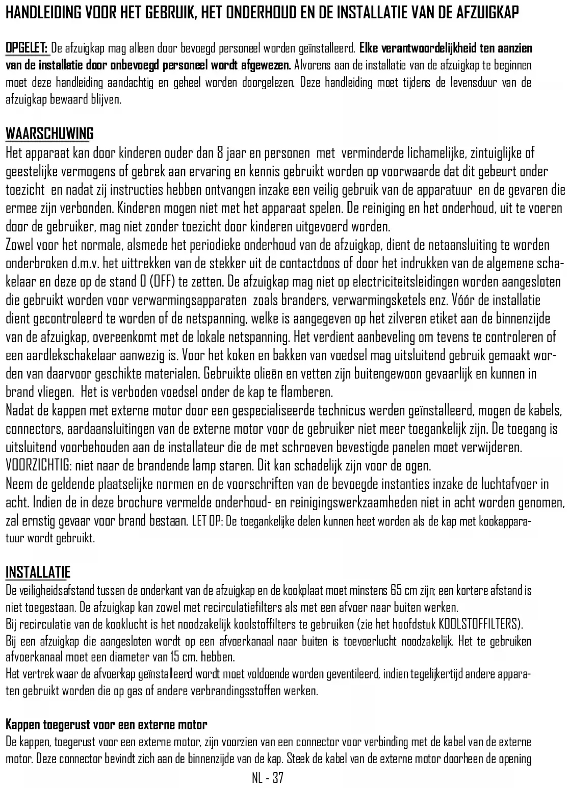 Avant d’effectuer toute intervention de nettoyage et de maintenance, couper l’alimentation de la hotte en mettant l'interrupteur général en position 0 (OFF). Remplacement des lampes Spot à led : Le spot ne doit être remplacé que par des techniciens qualifiés et uniquement en utilisant des pièces de rechange originales. Nettoyage des filtres métalliques Les filtres métalliques en dotation avec la hotte doivent être lavés tous les 2-3 mois en fonction de l'intensité d’utilisation, avec de l’eau chaude et du détergent liquide non agressif. Les filtres métalliques doivent être enlevés en utilisant la poignée spéciale en décrochant en premier le filtre dans la partie avant en le tirant vers le bas (Fig. 5). Filtres au carbone Si la hotte est utilisée avec système filtrant avec recyclage interne, il est nécessaire d’employer des filtres au carbone qui contiennent du carbone actif. Le carbone actif contenu dans les filtres, sert à retenir les odeurs des fumées de cuisine. Pour l’enlèvement et le remplacement des filtres faire réf. à la fig. 6 Les filtres au carbone en POLYESTER ne peuvent pas être régénérés ou lavés et doivent être remplacés périodiquement (tous les 4 mois si on utilise la hotte pendant deux heures par jour). Les filtres saturés de graisses peuvent en effet être cause d’in- cendies. Sur la base du modèle de hotte, les filtres au carbone peuvent être de forme circulaire ou bien rectangulaire. Le filtre à charbon LONG LIFE peut être nettoyé et reutilize. Le filtre doit être nettoyé tous les deux mois en utilization normale. II est recommandé de nettoyer le filtre dans un lave-vaisselle, à la température maximum ; utiliser un détergent normal. Aucun ustensile ménager ne doit être présent dans le lave – vaisselle lors du nettoyage du filtre, afin d’éviter tout dépôt de particules d’aliments qui risqueraient de causer ultérieurement de mauvaises odeurs. Pour réactiver le charbon, il suffit de mettre le filtre à sacher au four. Régler le four sur chaleur normale (pas sur “Gril”), à une temperature maximum de 100 °, et y laisser le filtre pendant 10 minutes. Le filtre doit être remplacé quand il n’est plus en mesure d’absorber de façon satisfaisante les odeurs de cuisson. (fig. 7) Condensation dans la hotte Les plaques à induction ou vitrocéramique réchauffent la nourriture très rapidement en produisant de la vapeur avec la cuis- son avant que la surface en verre ou en acier de la hotte ne se soit réchauffée. Ce qui provoque de la condensation sur la hotte avec comme conséquence la formation de gouttes d’eau. Une autre cause de la condensation pourrait être le fait que le conduit de sortie des fumées ne correspond pas aux dimensions que nous avons conseillé (voir paragraphe INSTALLATION). La vapeur qui reste dans la hotte pendant le refroidissement se condense en produisant des gouttes d’eau. Il est conseillé d'allumer la hotte dix minutes avant de commencer à cuisiner et, après avoir terminé, de la laisser allumée pour que toutes les fumées qui se sont accumulées dans le conduit puissent s’échapper. En outre il est très important de nettoyer régulièrement les filtres et, en cas de détérioration, de les remplacer (voir NETTOYA- GE des FILTRES MÉTALLIQUES). Nettoyage de la hotte Le nettoyage périodique des surfaces permet d'éviter de devoir par la suite éliminer avec beaucoup de difficulté des dépôts de salissures incrustées. Si la hotte est peinte ou cuivrée, utiliser un chiffon souple avec de l’eau tiède et un détergent neutre. Il est interdit de verser des liquides directement sur la hotte et d’utiliser des produits granuleux et/ou abrasifs. Si la hotte est en acier inox, utiliser des produits et des chiffons spéciaux pour l’acier inox satiné (non abrasifs et/ou corrosifs et sans chlore), en ayant soin de suivre avec le chiffon le sens du satinage. Ne pas utiliser de produits agressifs, dissolvants chimiques ou dérivés de distillats de pétrole qui pourraient laisser des résidus huileux susceptibles d’oxydation et de polymérisation. Hamlet - Romeo: Lorsque vous utilisez de l'huile pour cuire il se répandra dans la partie inférieure de la hotte, et donc cet endroit doit être nettoyé plus souvent que d'habitude. La firme constructrice ne répond pas de dommages esthétiques causés par la non observation des indica- tions énumérées ci-dessus.NL - 37 HANDLEIDING VOOR HET GEBRUIK, HET ONDERHOUD EN DE INSTALLATIE VAN DE AFZUIGKAP OPGELET: De afzuigkap mag alleen door bevoegd personeel worden geïnstalleerd. Elke verantwoordelijkheid ten aanzien van de installatie door onbevoegd personeel wordt afgewezen. Alvorens aan de installatie van de afzuigkap te beginnen moet deze handleiding aandachtig en geheel worden doorgelezen. Deze handleiding moet tijdens de levensduur van de afzuigkap bewaard blijven. WAARSCHUWING Het apparaat kan door kinderen ouder dan 8 jaar en personen met verminderde lichamelijke, zintuiglijke of geestelijke vermogens of gebrek aan ervaring en kennis gebruikt worden op voorwaarde dat dit gebeurt onder toezicht en nadat zij instructies hebben ontvangen inzake een veilig gebruik van de apparatuur en de gevaren die ermee zijn verbonden. Kinderen mogen niet met het apparaat spelen. De reiniging en het onderhoud, uit te voeren door de gebruiker, mag niet zonder toezicht door kinderen uitgevoerd worden. Zowel voor het normale, alsmede het periodieke onderhoud van de afzuigkap, dient de netaansluiting te worden onderbroken d.m.v. het uittrekken van de stekker uit de contactdoos of door het indrukken van de algemene scha- kelaar en deze op de stand 0 (OFF) te zetten. De afzuigkap mag niet op electriciteitsleidingen worden aangesloten die gebruikt worden voor verwarmingsapparaten zoals branders, verwarmingsketels enz. Vóór de installatie dient gecontroleerd te worden of de netspanning, welke is aangegeven op het zilveren etik