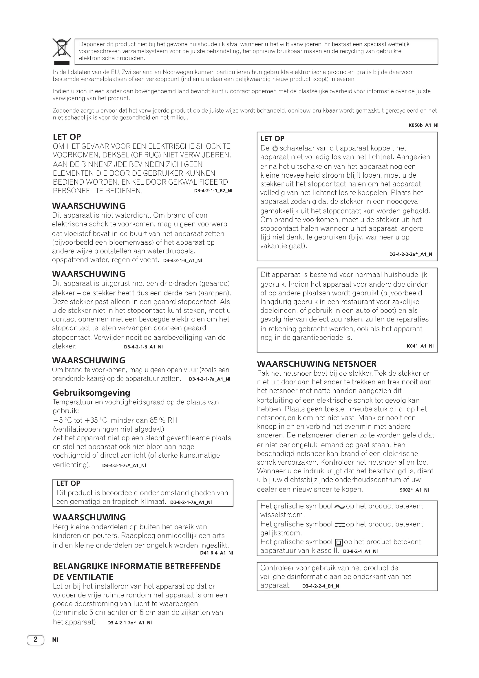 D3-4-2-1-7a_A1_Nl Gebruiksomgeving Temperatuur en vochtigheidsgraad op de plaats van gebruik: +5 °C tot +35 °C, minder dan 85 % RH (ventilatieopeningen niet afgedekt) Zet het apparaat niet op een slecht geventileerde plaats en stel het apparaat ook niet bloot aan hoge vochtigheid of direct zonlicht (of sterke kunstmatige verlichting). D3-4-2-1-7c*_A1_Nl LET OP De schakelaar van dit apparaat koppelt het apparaat niet volledig los van het lichtnet. Aangezien er na het uitschakelen van het apparaat nog een kleine hoeveelheid stroom blijft lopen, moet u de stekker uit het stopcontact halen om het apparaat volledig van het lichtnet los te koppelen. Plaats het apparaat zodanig dat de stekker in een noodgeval gemakkelijk uit het stopcontact kan worden gehaald. Om brand te voorkomen, moet u de stekker uit het stopcontact halen wanneer u het apparaat langere tijd niet denkt te gebruiken (bijv. wanneer u op vakantie gaat). D3-4-2-2-2a*_A1_Nl WAARSCHUWING Berg kleine onderdelen op buiten het bereik van kinderen en peuters. Raadpleeg onmiddellijk een arts indien kleine onderdelen per ongeluk worden ingeslikt. D41-6-4_A1_Nl Dit apparaat is bestemd voor normaal huishoudelijk gebruik. Indien het apparaat voor andere doeleinden of op andere plaatsen wordt gebruikt (bijvoorbeeld langdurig gebruik in een restaurant voor zakelijke doeleinden, of gebruik in een auto of boot) en als gevolg hiervan defect zou raken, zullen de reparaties in rekening gebracht worden, ook als het apparaat nog in de garantieperiode is. K041_A1_Nl Deponeer dit product niet bij het gewone huishoudelijk afval wanneer u het wilt verwijderen. Er bestaat een speciaal wettelijk voorgeschreven verzamelsysteem voor de juiste behandeling, het opnieuw bruikbaar maken en de recycling van gebruikte elektronische producten. In de lidstaten van de EU, Zwitserland en Noorwegen kunnen particulieren hun gebruikte elektronische producten gratis bij de daarvoor bestemde verzamelplaatsen of een verkooppunt (indien u aldaar een gelijkwaardig nieuw product koopt) inleveren. Indien u zich in een ander dan bovengenoemd land bevindt kunt u contact opnemen met de plaatselijke overheid voor informatie over de juiste verwijdering van het product. Zodoende zorgt u ervoor dat het verwijderde product op de juiste wijze wordt behandeld, opnieuw bruikbaar wordt gemaakt, t gere cycleerd en het niet schadelijk is voor de gezondheid en het milieu. K058b_A1_Nl WAARSCHUWING NETSNOER Pak het netsnoer beet bij de stekker. Trek de stekker er niet uit door aan het snoer te trekken en trek nooit aan het netsnoer met natte handen aangezien dit kortsluiting of een elektrische schok tot gevolg kan hebben. Plaats geen toestel, meubelstuk o.i.d. op het netsnoer, en klem het niet vast. Maak er nooit een knoop in en en verbind het evenmin met andere snoeren. De netsnoeren dienen zo te worden geleid dat er niet per ongeluk iemand op gaat staan. Een beschadigd netsnoer kan brand of een elektrische schok veroorzaken. Kontroleer het netsnoer af en toe. Wanneer u de indruk krijgt dat het beschadigd is, dient u bij uw dichtstbijzijnde onderhoudscentrum of uw dealer een nieuw snoer te kopen. S002*_A1_Nl Controleer voor gebruik van het product de veiligheidsinformatie aan de onderkant van het apparaat. D3-4-2-2-4_B1_Nl