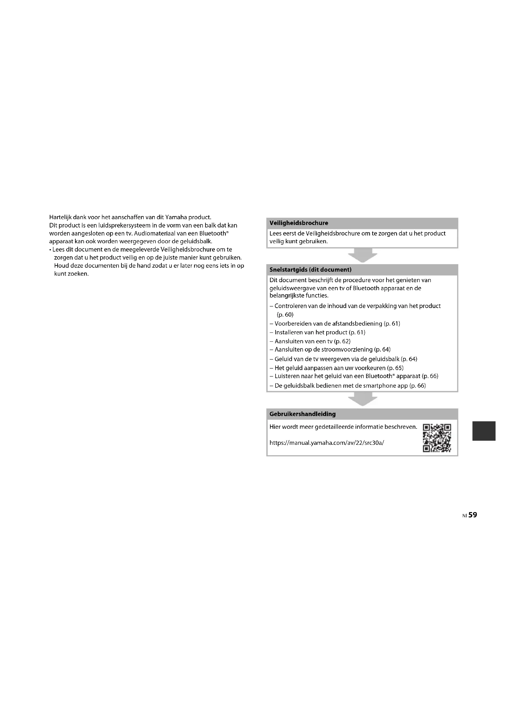 - Lees dit document en de meegeleverde Veiligheidsbrochure om te zorgen dat u het product veilig en op de juiste manier kunt gebruiken. Houd deze documenten bij de hand zodat u er later nog eens iets in op kunt zoeken. Veiligheidsbrochure Lees eerst de Veiligheidsbrochure om te zorgen dat u het product veilig kunt gebruiken. Snelstartgids (dit document) Dit document beschrijft de procedure voor het genieten van geluidsweergave van een tv of Bluetooth apparaat en de belangrijkste functies. − Controleren van de inhoud van de verpakking van het product (p. 60) − Voorbereiden van de afstandsbediening (p. 61) − Installeren van het product (p. 61) − Aansluiten van een tv (p. 62) − Aansluiten op de stroomvoorziening (p. 64) − Geluid van de tv weergeven via de geluidsbalk (p. 64) − Het geluid aanpassen aan uw voorkeuren (p. 65) − Luisteren naar het geluid van een Bluetooth® apparaat (p. 66) − De geluidsbalk bedienen met de smartphone app (p. 66) Gebruikershandleiding Hier wordt meer gedetailleerde informatie beschreven. https://manual.yamaha.com/av/22/src30a/ Snelstartgids NL60 Nl Dit product wordt geleverd met de volgende hoofdapparatuur en accessoires. Neem alle items uit de doos en controleer of alle vereiste items aanwezig zijn. Controleren van de inhoud van de verpakking van het product Geluidsbalk (SR-CUC30A) Afstandsbediening Optisch digitale audiokabel Netsnoeren (×2) Bevestigingssjabloon Afstandshouders (A: ×2, B: ×2, op 1 vel) OPMERKING
