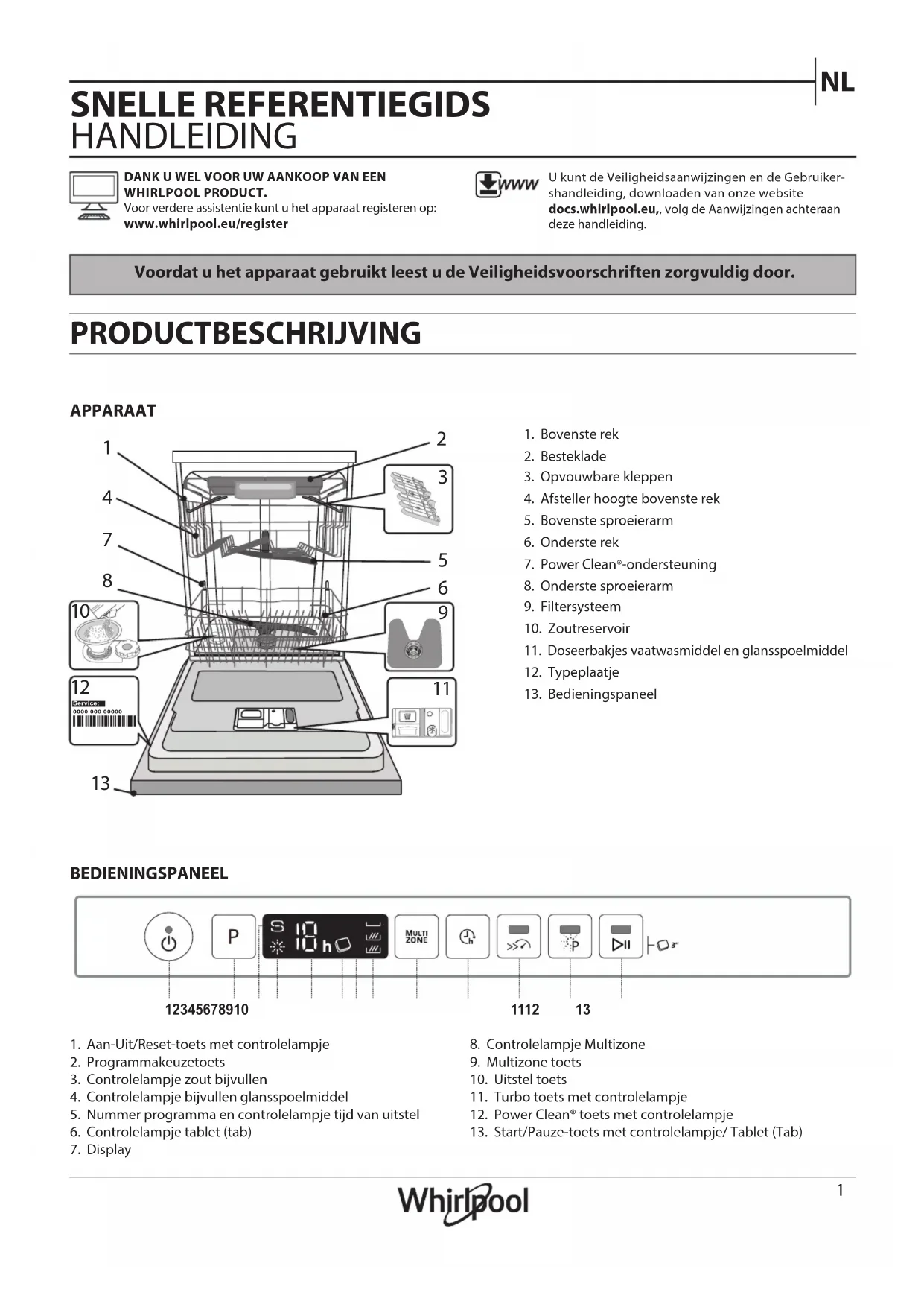 APPARAAT SNELLE REFERENTIEGIDS HANDLEIDING BEDIENINGSPANEEL DANK U WEL VOOR UW AANKOOP VAN EEN WHIRLPOOL PRODUCT. Voor verdere assistentie kunt u het apparaat registeren op:www.whirlpool.eu/registerU kunt de Veiligheidsaanwijzingen en de Gebruiker-shandleiding, downloaden van onze website docs.whirlpool.eu,, volg de Aanwijzingen achteraan deze handleiding.1. Bovenste rek2. Besteklade3. Opvouwbare kleppen4. Afsteller hoogte bovenste rek5. Bovenste sproeierarm6. Onderste rek7. Power Clean®-ondersteuning8. Onderste sproeierarm9. Filtersysteem10. Zoutreservoir11. Doseerbakjes vaatwasmiddel en glansspoelmiddel12. Typeplaatje13. Bedieningspaneel1. Aan-Uit/Reset-toets met controlelampje2. Programmakeuzetoets3. Controlelampje zout bijvullen4. Controlelampje bijvullen glansspoelmiddel5. Nummer programma en controlelampje tijd van uitstel6. Controlelampje tablet (tab)7. Display8. Controlelampje Multizone9. Multizone toets10. Uitstel toets11. Turbo toets met controlelampje12. Power Clean® toets met controlelampje13. Start/Pauze-toets met controlelampje/ Tablet (Tab) Voordat u het apparaat gebruikt leest u de Veiligheidsvoorschriften zorgvuldig door. PRODUCTBESCHRIJVING 1 2 3 4 5 6 7 8 9 1011 12 130000 000 00000 Service: