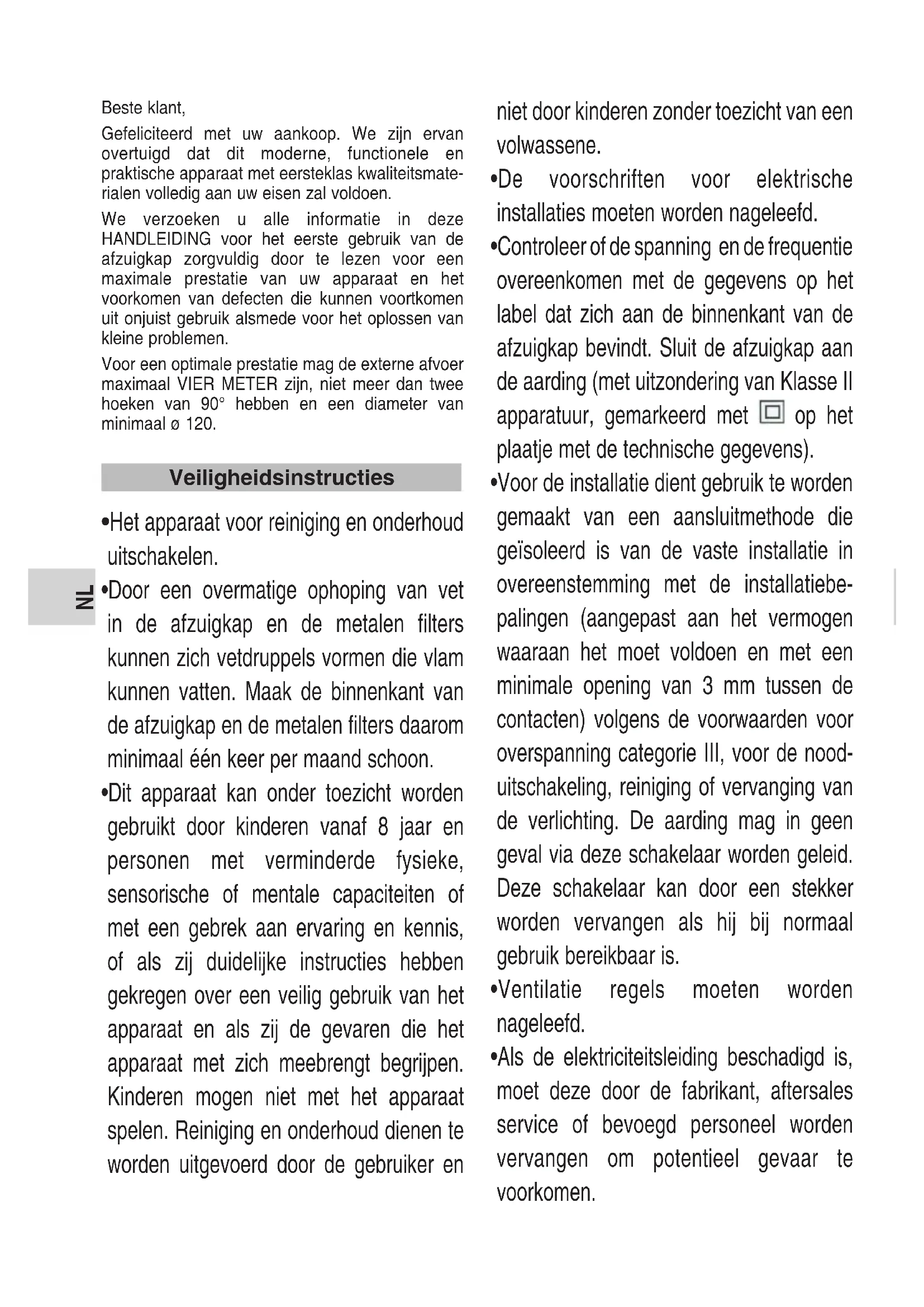 - Efter rengöring låt dem lufttorka och sedan placera dem i fläktkåpan.SV Om något ej Fungerar Innan du kontaktar Behörig Teknisk Service, kontrollera följande: När det ej är möjligt med direkt luftutsläpp kan köksfläkten ändras om så att luften recirkulerar genom ett aktivt kolfilter. Kolfiltrens varaktighet är på tre till sex månader, beroende på dess användning. Dessa filter kan ej rengöras eller återanvändas. När de är uttjänade bör de bytas tu. Tillverkaren förbehåller sig rätten att genomföra ändringar i sina apparater utan att detta medför skillnader i dess funktion. Aktivt Kolfilter (Valfritt)NL Beste klant, Gefeliciteerd met uw aankoop. We zijn ervan overtuigd dat dit moderne, functionele en praktische apparaat met eersteklas kwaliteitsmate- rialen volledig aan uw eisen zal voldoen. We verzoeken u alle informatie in deze HANDLEIDING voor het eerste gebruik van de afzuigkap zorgvuldig door te lezen voor een maximale prestatie van uw apparaat en het voorkomen van defecten die kunnen voortkomen uit onjuist gebruik alsmede voor het oplossen van kleine problemen. Voor een optimale prestatie mag de externe afvoer maximaal VIER METER zijn, niet meer dan twee hoeken van 90° hebben en een diameter van minimaal ø 120.