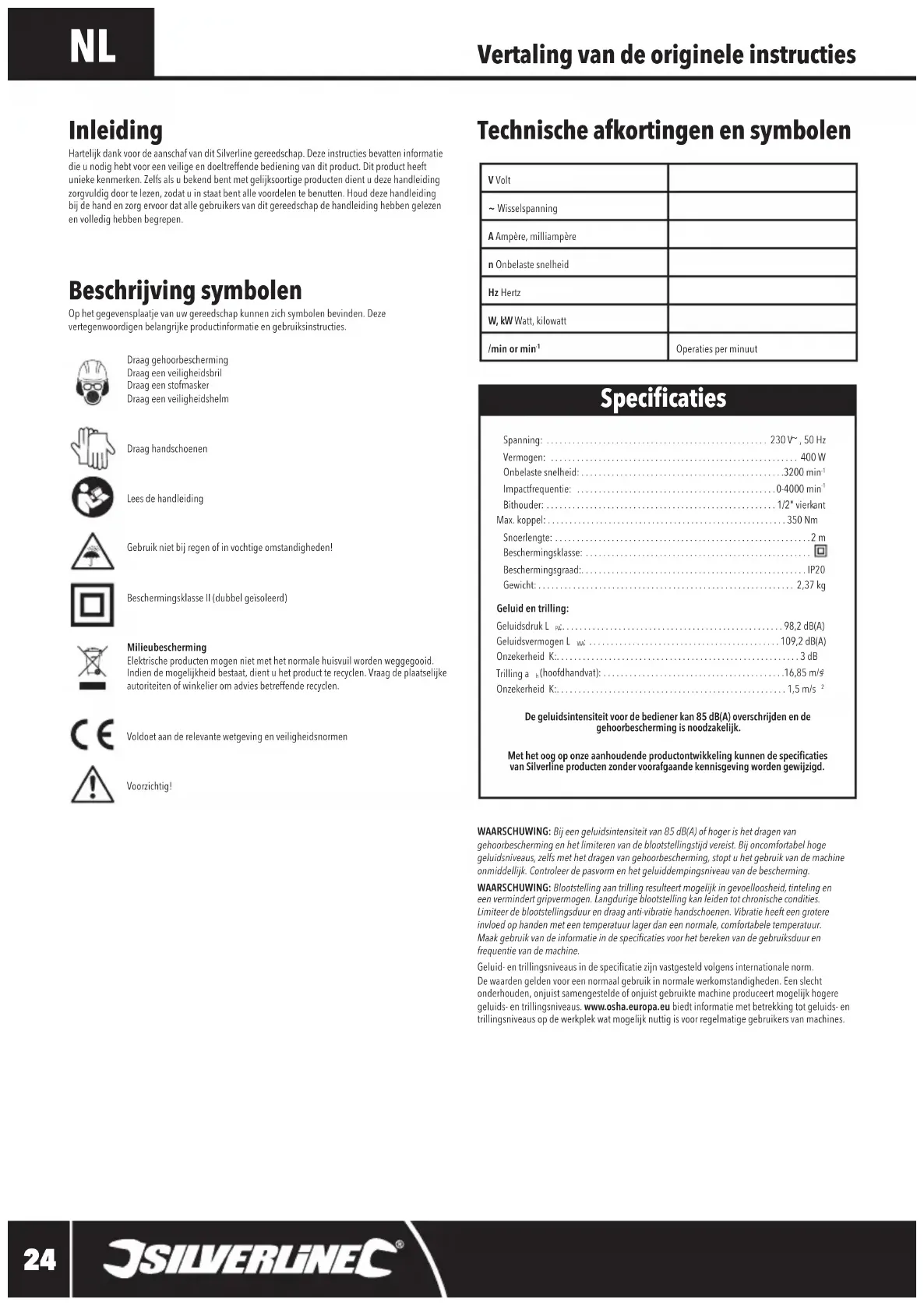 WAARSCHUWING: Bij een geluidsintensiteit van 85 dB(A) of hoger is het dragen van gehoorbescherming en het limiteren van de blootstellingstijd vereist. Bij oncomfortabel hoge geluidsniveaus, zelfs met het dragen van gehoorbescherming, stopt u het gebruik van de machine onmiddellijk. Controleer de pasvorm en het geluiddempingsniveau van de bescherming. WAARSCHUWING: Blootstelling aan trilling resulteert mogelijk in gevoelloosheid, tinteling en een vermindert gripvermogen. Langdurige blootstelling kan leiden tot chronische condities. Limiteer de blootstellingsduur en draag anti-vibratie handschoenen. Vibratie heeft een grotere invloed op handen met een temperatuur lager dan een normale, comfortabele temperatuur. Maak gebruik van de informatie in de specicaties voor het bereken van de gebruiksduur en frequentie van de machine.Geluid- en trillingsniveaus in de specicatie zijn vastgesteld volgens internationale norm. De waarden gelden voor een normaal gebruik in normale werkomstandigheden. Een slecht onderhouden, onjuist samengestelde of onjuist gebruikte machine produceert mogelijk hogere geluids- en trillingsniveaus. www.osha.europa.eu biedt informatie met betrekking tot geluids- en trillingsniveaus op de werkplek wat mogelijk nuttig is voor regelmatige gebruikers van machines. Vertaling van de originele instructies Technische afkortingen en symbolen Beschrijving symbolen Op het gegevensplaatje van uw gereedschap kunnen zich symbolen bevinden. Deze vertegenwoordigen belangrijke productinformatie en gebruiksinstructies.Draag gehoorbescherming Draag een veiligheidsbril Draag een stofmaskerDraag een veiligheidshelmDraag handschoenenLees de handleidingGebruik niet bij regen of in vochtige omstandigheden!Beschermingsklasse II (dubbel geïsoleerd)Milieubescherming Elektrische producten mogen niet met het normale huisvuil worden weggegooid. Indien de mogelijkheid bestaat, dient u het product te recyclen. Vraag de plaatselijke autoriteiten of winkelier om advies betreffende recyclen.Voldoet aan de relevante wetgeving en veiligheidsnormenVoorzichtig! Inleiding Hartelijk dank voor de aanschaf van dit Silverline gereedschap. Deze instructies bevatten informatie die u nodig hebt voor een veilige en doeltreffende bediening van dit product. Dit product heeft unieke kenmerken. Zelfs als u bekend bent met gelijksoortige producten dient u deze handleiding zorgvuldig door te lezen, zodat u in staat bent alle voordelen te benutten. Houd deze handleiding bij de hand en zorg ervoor dat alle gebruikers van dit gereedschap de handleiding hebben gelezen en volledig hebben begrepen.