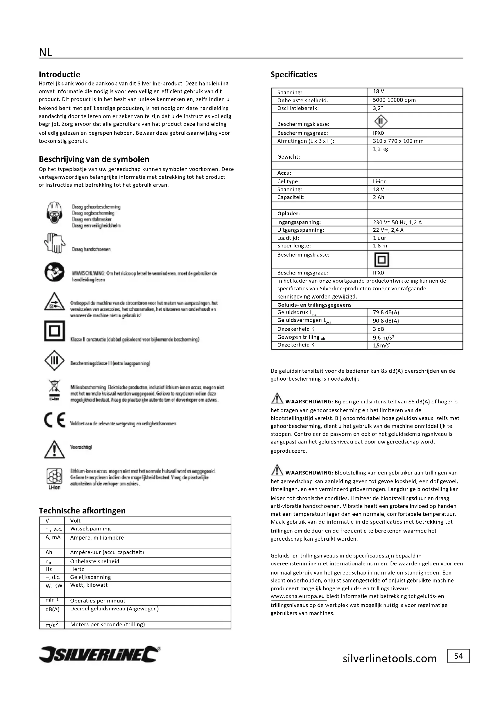 9,6# m/s² # Onzekerheid#K# 1,5#m/s² De#geluidsin tensiteit#voor#de#bediener#kan#85#dB(A)#overschrijden#en#de# gehoorbescherming#is#noodzakelijk.# +WAARSCHUWING:#Bij#een#geluidsintensiteit#van#85#dB(A)#of#hoger#is# het#dragen#van#gehoorbescherming#en#het#limiteren#van#de# blootstellingstijd#vereist.#Bij#oncomfortabel#hoge#geluidsniveaus,#zelfs#met# gehoorbescherming,#dient#u#het#gebruik#van#de#machine#onmiddellijk#te# stoppen.#Controleer#de#pasvo rm#en #ook#of#het#geluidsdem p ingsniveau #is# aangepast#aan#het#geluidsniveau#dat#door#uw#gereedschap#wordt# geproduceerd.# +WAARSCHUWING:#Blootstelling#van#een#gebruiker#aan#trillingen#van# het#gereedschap#kan#aanleiding#geven#tot#gevoelloosheid,#een#dof#gevoel,# tintelingen,#en#een #verm in de rd#grip vermogen.#Langd urige #bloo tstelling#ka n# leiden#tot#chronis c h e#c o n d it ie s.#L imiteer#de #b lo o ts te llin g sd u ur#en#draa g # anti-vibratie#handschoenen.#Vibratie#heeft#een#grotere#invloed#op#handen# met#een#temperatuur#lager#dan#een#normale,#comfortabele#temperatuur.# Maak#gebruik#van#de#informatie#in#de#specificaties#met#betrekking#tot# trillingen#om#de#d uu r#en#d e#freq ue ntie#te#b erek en en #wa arm e e#h et# gereedschap#kan#gebruikt#worden.# Geluids-#en#trillingsniveaus#in#de#specificaties#zijn#bepaald#in# overeenstemming#met#internationale#normen.#De#waarden#gelden#voor#een# normaal#gebruik#van#het#gereedschap#in#normale#omstandigheden.#Een# slecht#onderhouden ,#onjuist#samen gestelde#of#onjuist#gebruikte#m ach ine# produceert#mogelijk#hogere#geluid s-#en#trillingsniveaus.# www.osha.europa.eu#biedt#informatie#met#betrekking#tot#geluids-#en# trillingsniveaus#op#de #w erkp lek#w a t#m oge lijk#nuttig#is#voo r#rege lm atige # gebruikers#van#machines.#NL# silverlinetools.com# 55# Algemene+veiligheid+voor+elektrisch+gereedschap+ WAARSCHUWING:+Lees+alle+veiligheidswaarschuwingen,+instructies,+ illustratie s ,+e n +s p e c ific a tie s +d ie +met+dit+ge r e e d s chap+me e g e le v e rd+worde n .! Het!niet!naleven!van!alle!hiernavolgende!instructies!kan!resulteren!in! elektrische!schokken,!brand!en/of!ernstig!letsel.# Bewaar+deze+voorschriften+voor+toekomstig+gebruik.# De!term!“elektrisch!gereedschap”!in!alle!hieronder!vermelde! waarschuwingen!heeft!betrekking!op!uw !elektrisch e!g eree dsch a p!da t!op !de! stroom!is!aangesloten!(met!een!snoe r)!of!met!een!accu!w ordt!gevoed ! (snoerloos).#