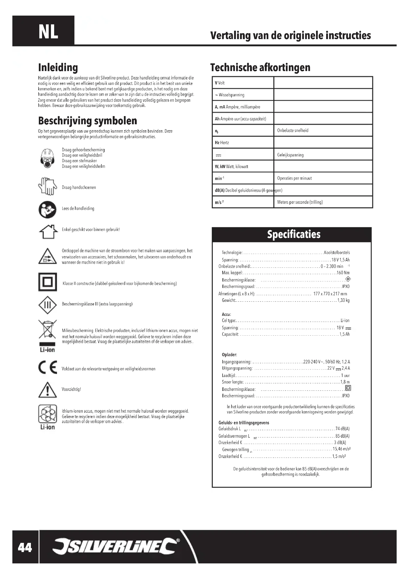 Vertaling van de originele instructies Beschrijving symbolen Ophetgegevensplaatjevanuwgereedschapkunnenzichsymbolenbevinden.Dezevertegenwoordigenbelangrijkeproductinformatieengebruiksinstructies.Draag gehoorbescherming Draag een veiligheidsbril Draag een stofmaskerDraag een veiligheidshelmDraag handschoenenLees de handleidingEnkel geschikt voor binnen gebruik!Ontkoppel de machine van de stroombron voor het maken van aanpassingen, het verwisselenvanaccessoires,hetschoonmaken,hetuitvoerenvanonderhoudtenwanneerdemachinenietingebruikis!KlasseIIconstructie(dubbelgeïsoleerdvoorbijkomendebescherming)Beschermingsklasse III (extra laagspanning) Milieubescherming Elektrische producten, inclusief lithium-ionen accus, mogen niet methetnormalehuisvuilwordenweggegooid.Gelieveterecyclerenindiendezemogelijkheidbestaat.Vraagdeplaatselijkeautoriteitenofdeverkoperomadvies. VoldoetaanderelevantewetgevingenveiligheidsnormenVoorzichtig!ithium-ionenaccus,mogennietmethetnormalehuisvuilwordenweggegooid.Gelieveterecyclerenindiendezemogelijkheidbestaat.Vraagdeplaatselijkeautoriteiten of de verkoper om advies . Inleiding HartelijkdankvoordeaankoopvanditSilverline-product.Dezehandleidingomvatinformatiedienodigisvooreenveiligenefciëntgebruikvanditproduct.Ditproductisinhetbezitvanuniekekenmerkenen,zelfsindienubekendbentmetgelijkaardigeproducten,ishetnodigomdezehandleidingaandachtigdoortelezenomerzekervantezijndatudeinstructiesvolledigbegrijpt.Zorg ervoor dat alle gebruikers van het product deze handleiding volledig gelezen en begrepen hebben.Bewaardezegebruiksaanwijzingvoortoekomstiggebruik.