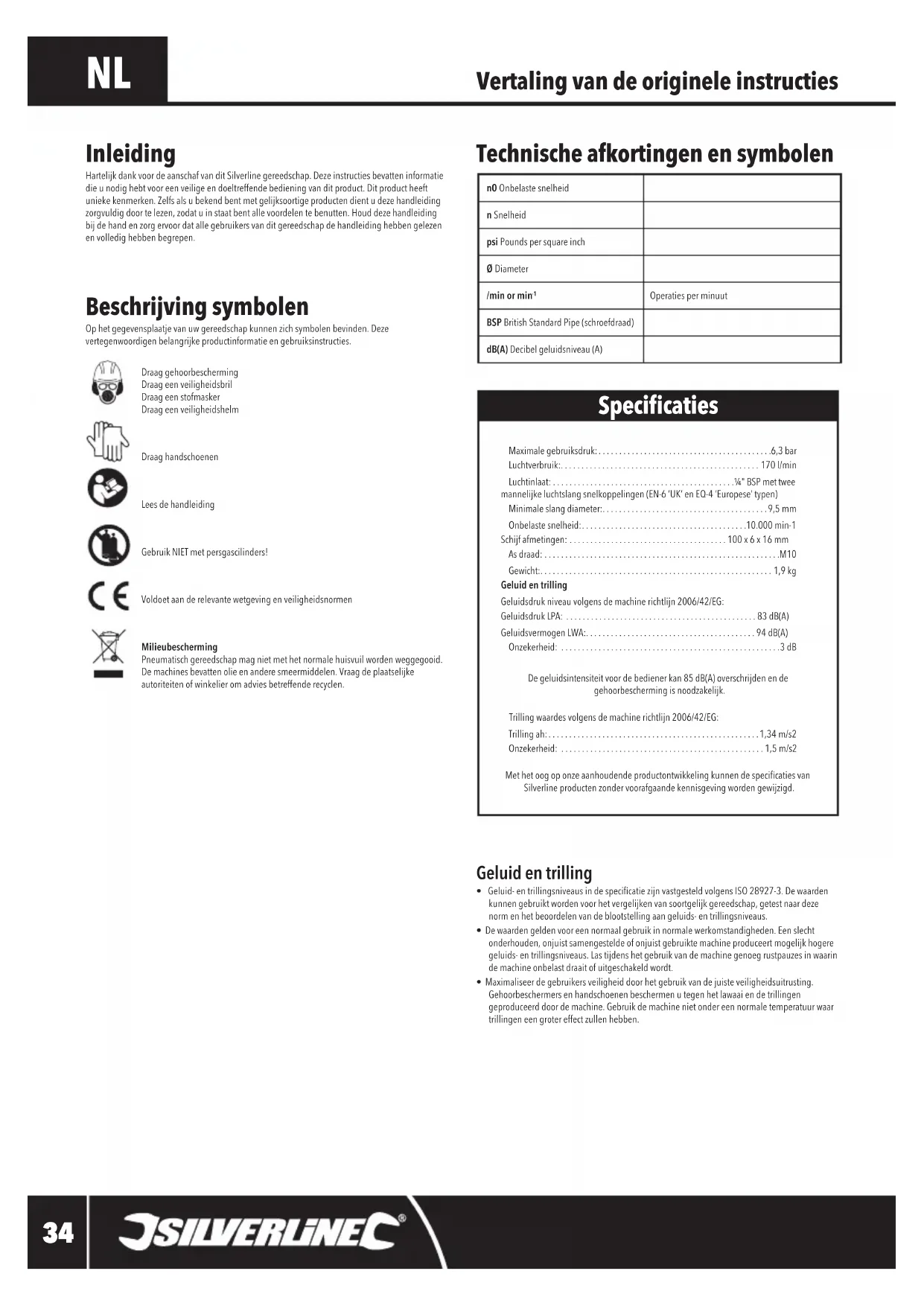 - Geluid-entrillingsniveausindespecicatiezijnvastgesteldvolgensISO28927-3.Dewaarden kunnengebruiktwordenvoorhetvergelijkenvansoortgelijkgereedschap,getestnaardezenorm en het beoordelen van de blootstelling aan geluids- en trillingsniveaus.• Dewaardengeldenvooreennormaalgebruikinnormalewerkomstandigheden.Eenslechtonderhouden, onjuist samengestelde of onjuist gebruikte machine produceert mogelijk hogere geluids-entrillingsniveaus.Lastijdenshetgebruikvandemachinegenoegrustpauzesinwaarindemachineonbelastdraaitofuitgeschakeldwordt.• Maximaliseer de gebruikers veiligheid door het gebruik van de juiste veiligheidsuitrusting. Gehoorbeschermersenhandschoenenbeschermenutegenhetlawaaiendetrillingengeproduceerddoordemachine.Gebruikdemachinenietondereennormaletemperatuurwaartrillingen een groter effect zullen hebben. Vertaling van de originele instructies Technische afkortingen en symbolen Beschrijving symbolen Ophetgegevensplaatjevanuwgereedschapkunnenzichsymbolenbevinden.Dezevertegenwoordigenbelangrijkeproductinformatieengebruiksinstructies.Draag gehoorbescherming Draag een veiligheidsbril Draag een stofmaskerDraag een veiligheidshelmDraag handschoenenLees de handleidingGebruikNIETmetpersgascilinders!VoldoetaanderelevantewetgevingenveiligheidsnormenMilieubescherming Pneumatischgereedschapmagnietmethetnormalehuisvuilwordenweggegooid.De machines bevatten olie en andere smeermiddelen. Vraag de plaatselijke autoriteitenofwinkelieromadviesbetreffenderecyclen.n0 Onbelaste snelheidn Snelheidpsi Pounds per square inchØ Diameter/min or min Operaties per minuutBSP British Standard Pipe (schroefdraad)dB(A) Decibel geluidsniveau (A) Inleiding Hartelijk dank voor de aanschaf van dit Silverline gereedschap. Deze instructies bevatten informatie die u nodig hebt voor een veilige en doeltreffende bediening van dit product. Dit product heeft unieke kenmerken. Zelfs als u bekend bent met gelijksoortige producten dient u deze handleiding zorgvuldig door te lezen, zodat u in staat bent alle voordelen te benutten. Houd deze handleiding bij de hand en zorg ervoor dat alle gebruikers van dit gereedschap de handleiding hebben gelezen en volledig hebben begrepen. Specicaties Specicaties Maximale gebruiksdruk:..........................................6,3 bar Luchtverbruik:................................................170 l/min Luchtinlaat: . . . . . . . . . . . . . . . . . . . . . . . . . . . . . . . . . . . . . . . . . . . .¼"BSPmettwee mannelijke luchtslang snelkoppelingen (EN-6 ‘UK’ en EQ-4 ‘Europese’ typen) Minimale slang diameter:........................................9,5 mm Onbelaste snelheid:........................................10.000 min-1 Schijf afmetingen: ......................................100 x 6 x 16 mm As draad: .........................................................M10 Gewicht:........................................................1,9 kg Geluid en trilling Geluidsdruk niveau volgens de machine richtlijn 2006/42/EG: Geluidsdruk LPA: ..............................................83 dB(A) Geluidsvermogen LWA:.........................................94 dB(A) Onzekerheid: .....................................................3 dB De geluidsintensiteit voor de bediener kan 85 dB(A) overschrijden en de gehoorbescherming is noodzakelijk. Trillingwaardesvolgensdemachinerichtlijn2006/42/EG: Trilling ah:...................................................1,34 m/s2 Onzekerheid: .................................................1,5 m/s2 MethetoogoponzeaanhoudendeproductontwikkelingkunnendespecicatiesvanSilverlineproductenzondervoorafgaandekennisgevingwordengewijzigd. 196512_Manual.indd 34 30/08/2017 17:20Pneumatische haakse slijpmachine196512