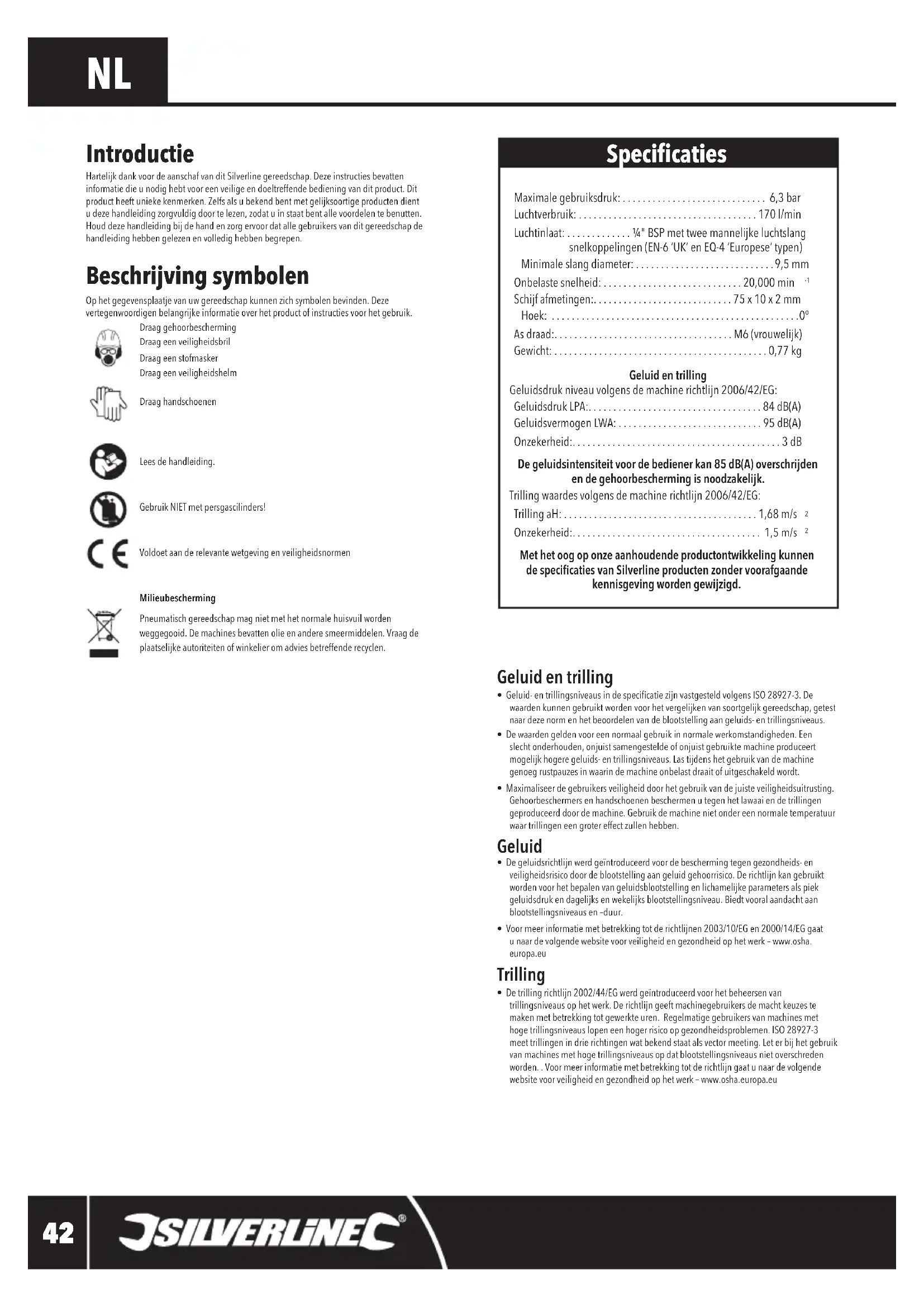 - De trilling richtlijn 2002/44/EG werd geïntroduceerd voor het beheersen van trillingsniveaus op het werk. De richtlijn geeft machinegebruikers de macht keuzes te maken met betrekking tot gewerkte uren. Regelmatige gebruikers van machines met hoge trillingsniveaus lopen een hoger risico op gezondheidsproblemen. ISO 28927-3 meet trillingen in drie richtingen wat bekend staat als vector meeting. Let er bij het gebruik van machines met hoge trillingsniveaus op dat blootstellingsniveaus niet overschreden worden. . Voor meer informatie met betrekking tot de richtlijn gaat u naar de volgende website voor veiligheid en gezondheid op het werk – www.osha.europa.eu Specicaties Maximale gebruiksdruk: ............................. 6,3 bar Luchtverbruik: ....................................170 l/min Luchtinlaat: . . . . . . . . . . . . . ¼" BSP met twee mannelijke luchtslang snelkoppelingen (EN-6 ‘UK’ en EQ-4 ‘Europese’ typen) Minimale slang diameter: ............................9,5 mm Onbelaste snelheid: ............................20,000 min Schijf afmetingen:............................75 x 10 x 2 mm Hoek: ..................................................0° As draad:....................................M6 (vrouwelijk) Gewicht: ...........................................0,77 kgGeluid en trillingGeluidsdruk niveau volgens de machine richtlijn 2006/42/EG: Geluidsdruk LPA:...................................84 dB(A) Geluidsvermogen LWA: .............................95 dB(A) Onzekerheid:..........................................3 dBDe geluidsintensiteit voor de bediener kan 85 dB(A) overschrijden en de gehoorbescherming is noodzakelijk. Trilling waardes volgens de machine richtlijn 2006/42/EG: Trilling aH: .......................................1,68 m/s Onzekerheid:...................................... 1,5 m/s Met het oog op onze aanhoudende productontwikkeling kunnen de specicaties van Silverline producten zonder voorafgaande kennisgeving worden gewijzigd. Introductie Hartelijk dank voor de aanschaf van dit Silverline gereedschap. Deze instructies bevatten informatie die u nodig hebt voor een veilige en doeltreffende bediening van dit product. Dit product heeft unieke kenmerken. Zelfs als u bekend bent met gelijksoortige producten dient u deze handleiding zorgvuldig door te lezen, zodat u in staat bent alle voordelen te benutten. Houd deze handleiding bij de hand en zorg ervoor dat alle gebruikers van dit gereedschap de handleiding hebben gelezen en volledig hebben begrepen.598446_Z1MANPRO1.indd 42 15/02/2017 12:4143 silverlinetools.com Pneumatische slijper 598446