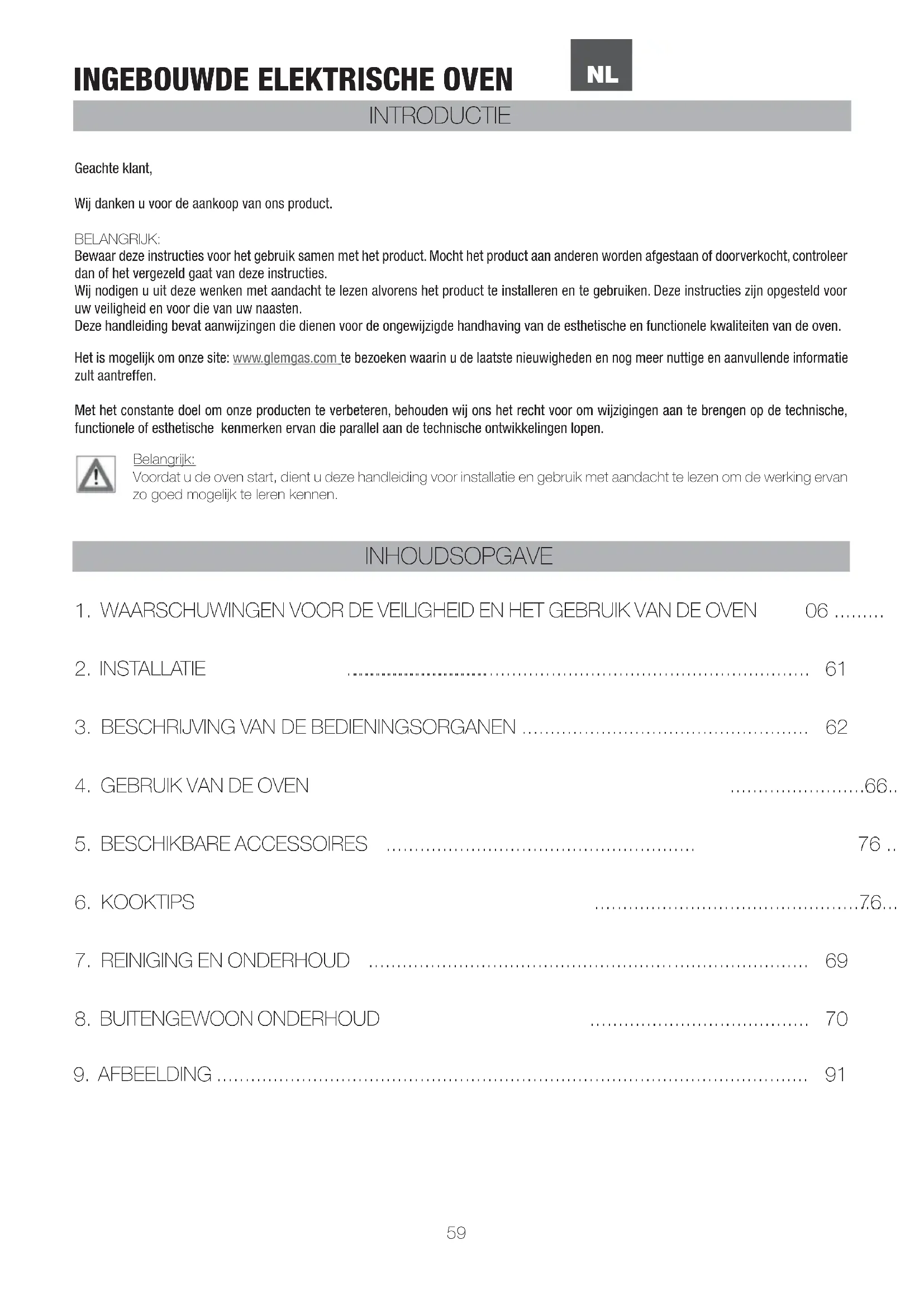 NOTAS PT59 Geachte klant, Wij danken u voor de aankoop van ons product. BELANGRIJK: Bewaar deze instructies voor het gebruik samen met het product. Mocht het product aan anderen worden afgestaan of doorverkocht, controleer dan of het vergezeld gaat van deze instructies. Wij nodigen u uit deze wenken met aandacht te lezen alvorens het product te installeren en te gebruiken. Deze instructies zijn opgesteld voor uw veiligheid en voor die van uw naasten. Deze handleiding bevat aanwijzingen die dienen voor de ongewijzigde handhaving van de esthetische en functionele kwaliteiten van de oven. Het is mogelijk om onze site: www.glemgas.com te bezoeken waarin u de laatste nieuwigheden en nog meer nuttige en aanvullende informatie zult aantreffen. Met het constante doel om onze producten te verbeteren, behouden wij ons het recht voor om wijzigingen aan te brengen op de technische, functionele of esthetische kenmerken ervan die parallel aan de technische ontwikkelingen lopen. Belangrijk: Voordat u de oven start, dient u deze handleiding voor installatie en gebruik met aandacht te lezen om de werking ervan zo goed mogelijk te leren kennen. INTRODUCTIE