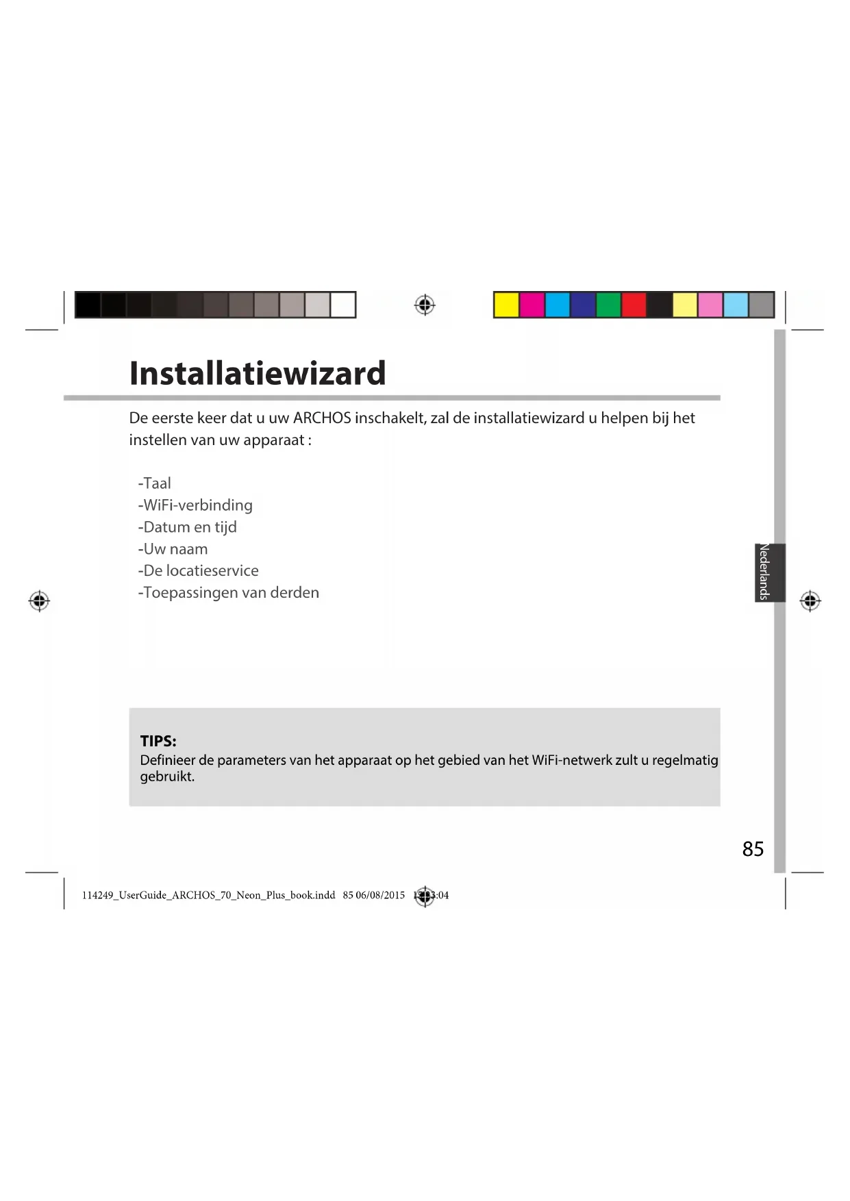 114249_UserGuide_ARCHOS_70_Neon_Plus_book.indd 84 06/08/2015 15:23:0485 Nederlands Installatiewizard TIPS: Definieer de parameters van het apparaat op het gebied van het WiFi-netwerk zult u regelmatig gebruikt. De eerste keer dat u uw ARCHOS inschakelt, zal de installatiewizard u helpen bij het instellen van uw apparaat : - Taal - WiFi-verbinding - Datum en tijd - Uw naam - De locatieservice - Toepassingen van derden 114249_UserGuide_ARCHOS_70_Neon_Plus_book.indd 85 06/08/2015 15:23:0486