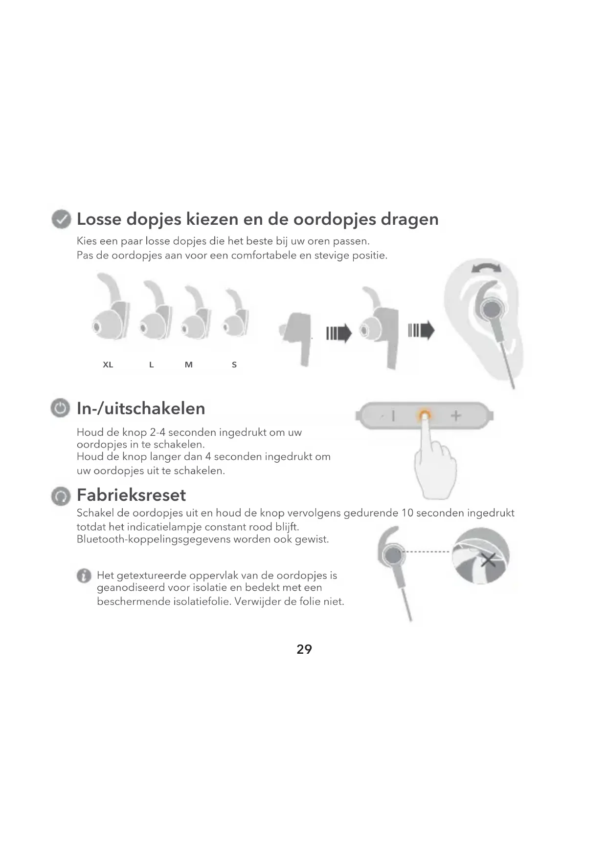 Het getextureerde oppervlak van de oordopjes is geanodiseerd voor isolatie en bedekt met een beschermende isolatiefolie. Verwijder de folie niet.30 Koppelen Wanneer de oordopjes voor de eerste keer worden ingeschakeld, gaan deze automatisch naar de Koppelingsmodus. Opnieuw verbinden bij inschakelen Wanneer u de oordopjes inschakelt, maken ze automatisch opnieuw verbinding met de laatste telefoon waarmee ze verbonden waren. Opnieuw verbinden na een verbroken verbinding door lange afstand Verbinding maken met twee telefoons