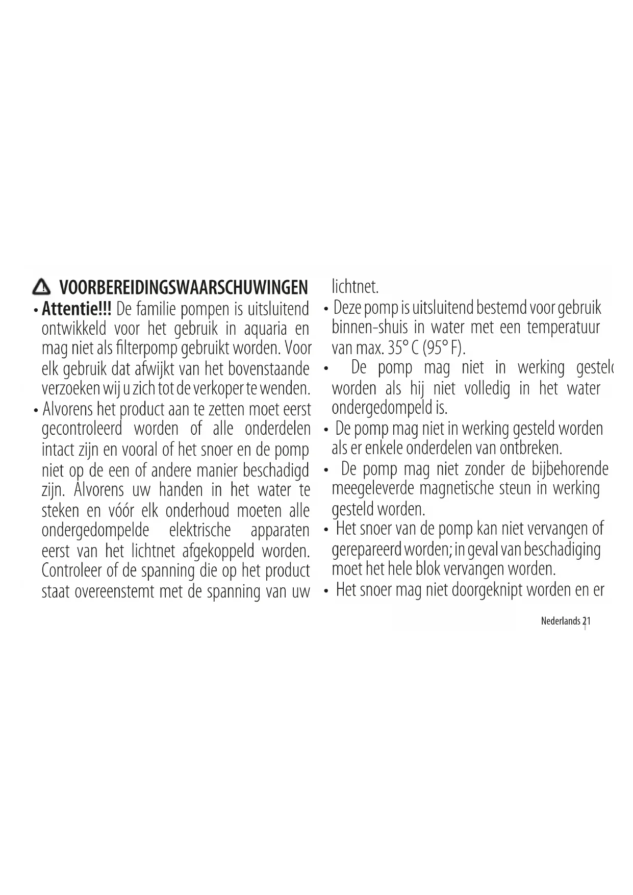 - Deze pomp is uitsluitend bestemd voor gebruik binnen-shuis in water met een temperatuur van max. 35° C (95° F).
