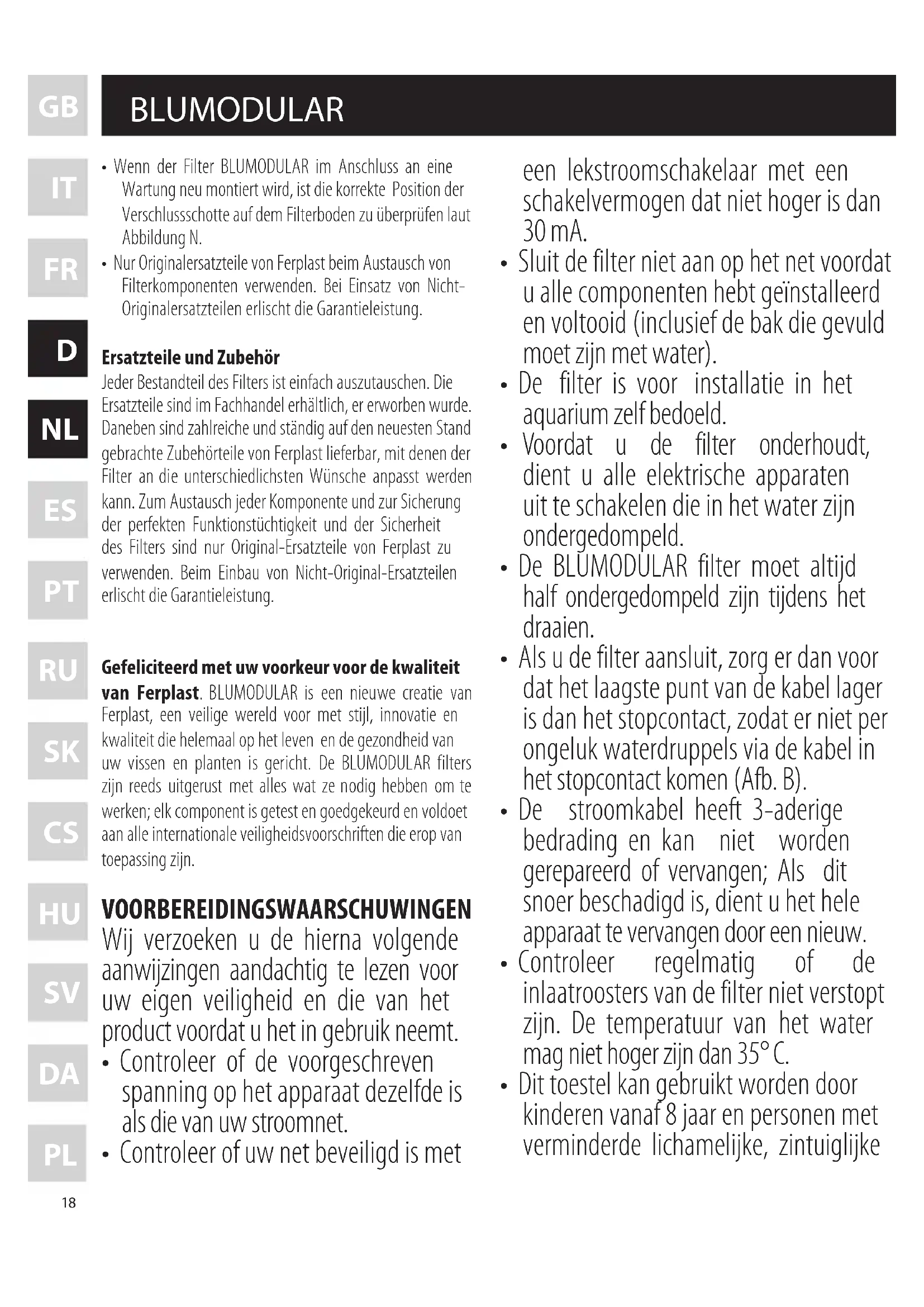 - de sproeistang met dop onderaan (Afb. O). BLUMODULAR is een filter waarmee u alle kanten op kan, die in elk aquarium past en voor verschillende doeleinden kan worden gebruikt. Het kan de hoofdfilter zijn in een klein aquarium of een middelgrote bak met niet al te veel vissen, of het kan een secundaire filter zijn (liefst in combinatie met een biologische filter zoals die van het gamma BLUWAVE van Ferplast) om het water helder te houden, het actieve koolstof BLUCARBON te bevatten, het zeoliet BLUZEOLITE, de vezel BLUFIBRE, hars en ander chemisch of absorberend materiaal. BLUMODULAR helpt het water helder en klaar te houden, ook in overbevolkte aquariums. Dankzij de opbouwvakjes die u naar wenst op kunt bouwen en kunt samenstellen, kunt u tegelijkertijd verschillende filtermaterialen gebruiken en toch een altijd snel en sterk draaiende filterpomp garanderen. De materialen die bij de filter horen kunt u naar believen vervangen door andere; wij raden in elk geval een spons met grote gaatjes in het eerste vakje onderaan te doen om de grootste vuildeeltjes tegen te houden, terwijl u de andere naar wens kunt vullen met ander filtermateriaal (pas op om “dik” materiaal niet te hard samen te drukken waardoor het water er niet goed meer doorstroomt en/of de filter verstopt kan raken. Doe dit materiaal in het laatste vakje bovenaan onder de pomp). De blumodular filters 01 • 02 • 03 onderhouden Wij raden de volgende onderhoudsmaatregelen aan: 1 (Afb. L). Spoel minstens om de 2-3 weken alle mechanische filtersponzen uit 2 Vervang de mechanische filtersponzen minstens om het half jaar. Gebruik alleen nieuwe originele materialen van Ferplast. 3 Een absorberende filterspons is na 2 of 3 weken uitgewerkt. Wij raden u dus aan om een nieuwe spons ter beschikking te houden of de spons in de filter te laten zitten maar minstens om de 2-3 weken uit te spoelen. In elk geval dient u een oude spons na 6 maanden te vervangen door een nieuwe. 4 Als de vissen een speciale behandeling nodig hebben om gezondheidsredenen, dient u de spons uit de filter te halen (zodat de behandelingsmiddelen optimaal kunnen werken). Na een behandelingsperiode is het beter een nieuwe spons in de filter te doen. 5 Houd de inlaatroosters op de filter altijd schoon. 6 (Afb. M). Controleer de pomp van de BLUMODULAR filter minstens om het half jaar Reinig de pomp eventueel op de volgende manier: