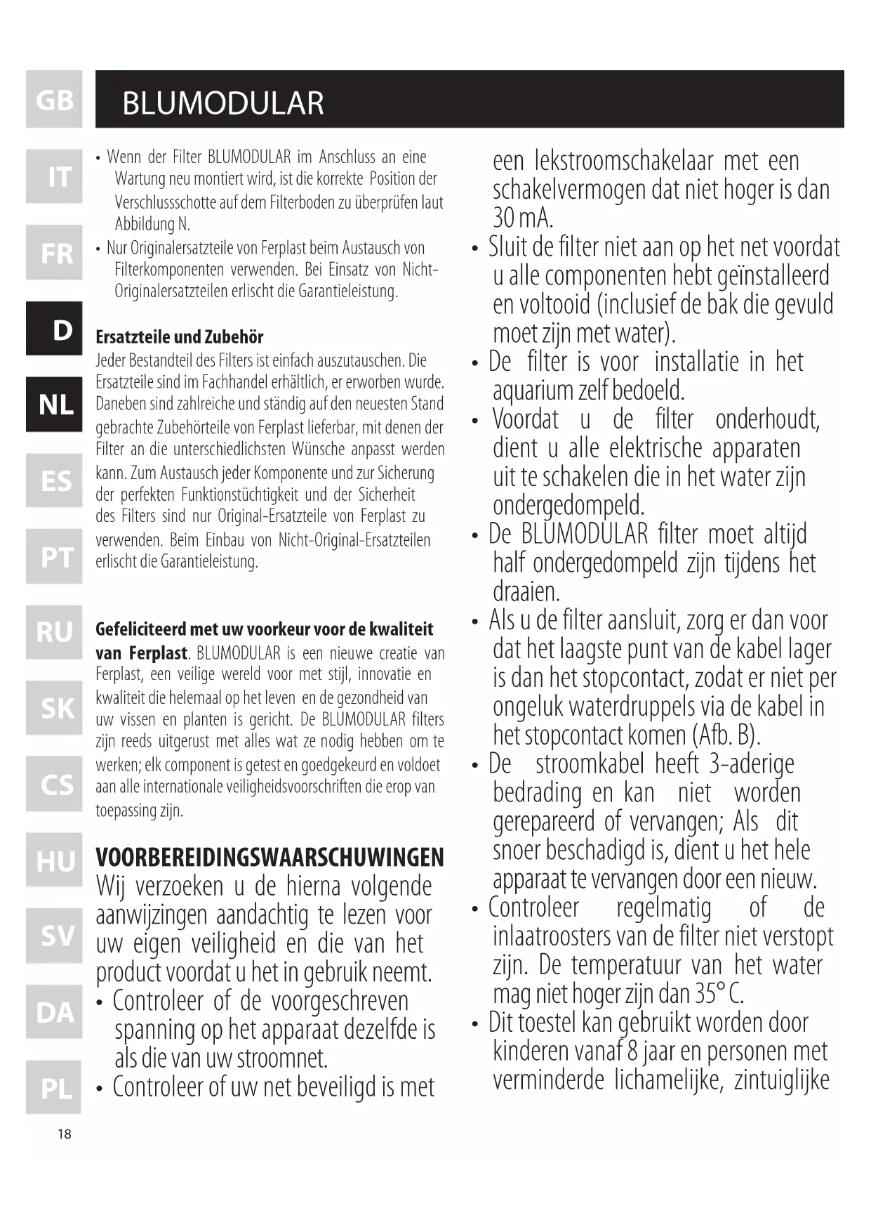- Vervang componenten van de filter alleen door nieuwe originele componenten van Ferplast. De garantie vervalt als u andere onderdelen gebruikt. Onderdelen en accessoires Elk deel van de filter kan makkelijk worden vervangen. De onderdelen vindt u in de winkel waar u de filter gekocht hebt. Deze winkels bieden bovendien ontelbare accessoires van Ferplast aan die voortdurend vernieuwd worden en nuttig zijn om uw filter aan te passen aan uw gewijzigde behoeftes. Gebruik alleen originele onderdelen van Ferplast zodat u altijd zeker kunt zijn van een goed werkend en veilig product. De garantie vervalt als u andere onderdelen gebruikt. BLUMODULAR 360069-3_FI BLUMODULAR.indd 20 09/08/18 14:4321