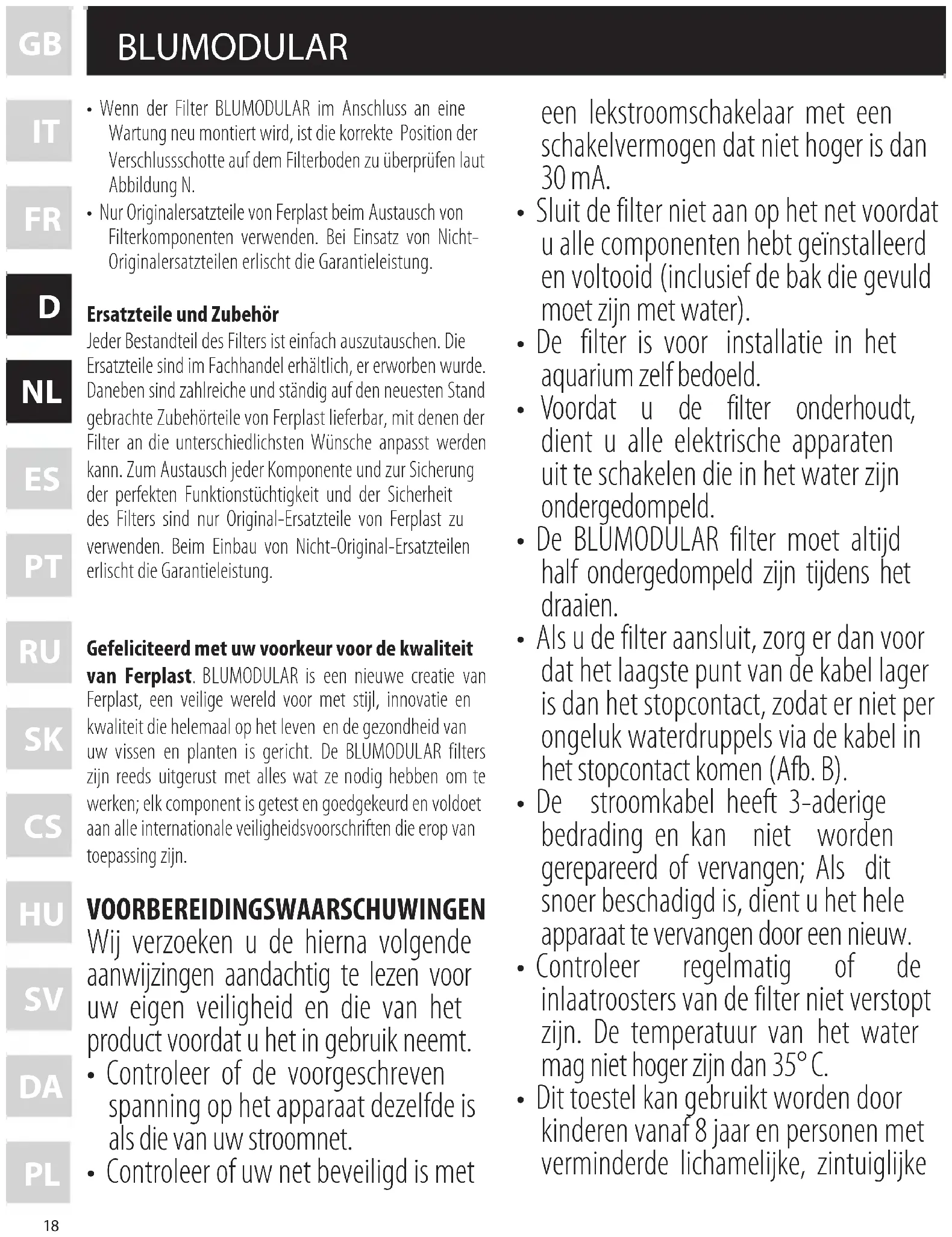 - Vervang componenten van de filter alleen door nieuwe originele componenten van Ferplast. De garantie vervalt als u andere onderdelen gebruikt. Onderdelen en accessoires Elk deel van de filter kan makkelijk worden vervangen. De onderdelen vindt u in de winkel waar u de filter gekocht hebt. Deze winkels bieden bovendien ontelbare accessoires van Ferplast aan die voortdurend vernieuwd worden en nuttig zijn om uw filter aan te passen aan uw gewijzigde behoeftes. Gebruik alleen originele onderdelen van Ferplast zodat u altijd zeker kunt zijn van een goed werkend en veilig product. De garantie vervalt als u andere onderdelen gebruikt. BLUMODULAR 360069-3_FI BLUMODULAR.indd 20 09/08/18 14:4321