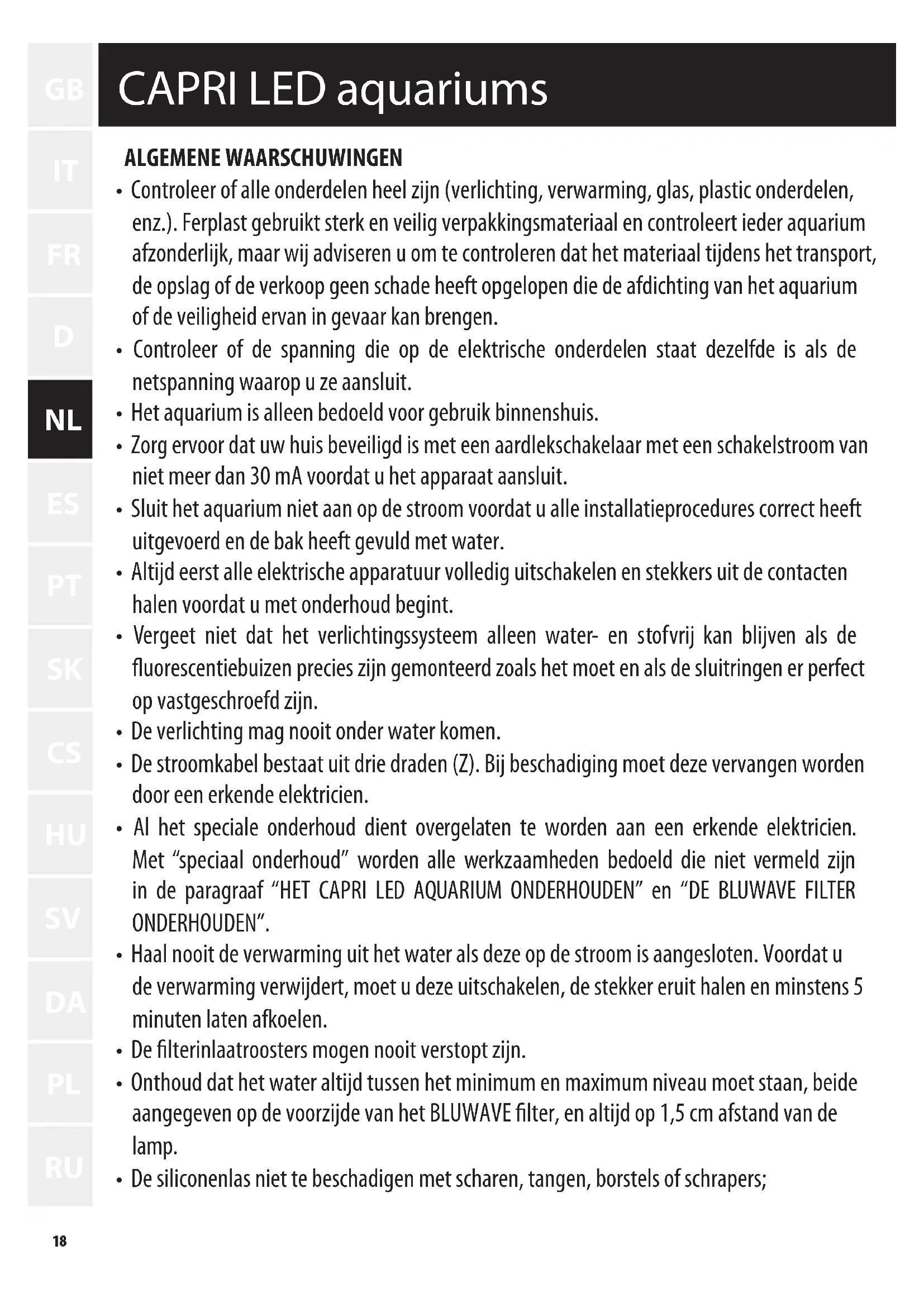 - Al het speciale onderhoud dient overgelaten te worden aan een erkende elektricien. Met “speciaal onderhoud” worden alle werkzaamheden bedoeld die niet vermeld zijn in de paragraaf “HET CAPRI LED AQUARIUM ONDERHOUDEN” en “DE BLUWAVE FILTER ONDERHOUDEN”.