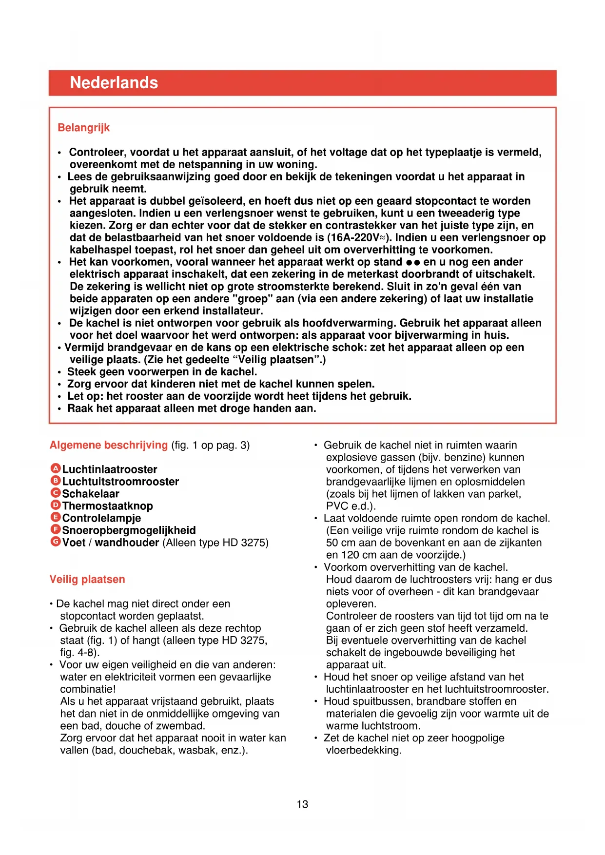 Thermostaatknop (D) Met de thermostaatknop kunt u een vaste kamertemperatuur instellen. Als de keuzeschakelaar in stand 1 of 2 staat, wordt de kachel automatisch ingeschakeld (respectievelijk op half vermogen of op vol vermogen) zodra de kamertemperatuur beneden de ingestelde temperatuur daalt. Zodra de ingestelde kamertemperatuur is bereikt, schakelt de kachel zichzelf uit. Draai de knop linksom voor het instellen van een hogere temperatuur of rechtsom voor een lagere temperatuur. U kunt de thermostaat tijdens het gebruik bijregelen. Om de meest geschikte stand van de thermostaat te vinden: - Zet eerst de thermostaatknop op de hoogste stand. (Linksom draaien tot de knop niet verder kan.) - Zodra u de temperatuur behaaglijk vindt, draait u de knop langzaam rechtsom totdat de kachel uitschakelt. y = "Vorstvrij"-stand. Deze stand komt overeen met de laagste thermostaatstand, d.i. ca. +5 °C. Deze stand kan worden gebruikt om de direkte omgeving van de kachel vorstvrij te houden. Om bijvoorbeeld een waterleiding vorstvrij te houden, zet u de kachel dicht bij de leiding en schakelt u de kachel in op deze stand. Let op: Wanneer u de functie koele lucht > kiest, dient de thermostaatknop in de hoogste stand te staan. Controlelampje - Wanneer het apparaat is aangesloten en ingeschakeld op stand >, 1 of 2, gaat het controlelampje (E) branden. - Het lampje blijft branden totdat het apparaat wordt uitgeschakeld door de keuzeschakelaar in stand O te zetten of de stekker uit het stopcontact te nemen. - Om aan te geven dat het apparaat nog steeds is aangesloten en in stand "ingeschakeld" (>, 1 of 2) staat, blijft het controlelampje branden wanneer de ingestelde temperatuur is bereikt en de thermostaat het apparaat uitschakelt. Om dezelfde reden blijft het lampje branden wanneer de ingebouwde beveiliging tegen oververhitting het apparaat uitschakelt. Beveiliging tegen oververhitting Om schade en risico als gevolg van oververhitting te voorkomen, schakelt de ingebouwde beveiliging de stroom uit zodra de verwarmingselementen te heet worden. Indien dit mocht gebeuren: - Overtuig u er eerst van dat het niet de thermostaat was, waardoor de kachel werd uitgeschakeld. Zet de thermostaat in de hoogste stand. Als de kachel niet gaat werken, was het inderdaad de beveiliging die het apparaat heeft uitgeschakeld. - Neem de stekker uit het stopcontact. - Laat de kachel 30 minuten afkoelen. - Controleer of u het apparaat op de juiste manier hebt geplaatst. - Controleer of iets de doorstroming van lucht belemmert. Maak zonodig de luchtroosters schoon met behulp van een stofzuiger. - Steek de stekker weer in het stopcontact en schakel de kachel weer in. Als de beveiliging de kachel opnieuw mocht uitschakelen: - Neem de stekker uit het stopcontact. - Laat de kachel door uw leverancier of in een Philips Service Centrum controleren. Schoonmaken - Zet de keuzeschakelaar (C) in stand O om het apparaat uit te schakelen. - Neem de stekker uit het stopcontact. - Wacht totdat de kachel voldoende is afgekoeld. - U kunt de buitenkant van de kachel schoonmaken met een vochtige doek. Zorg ervoor dat er geen water in het apparaat komt. - Met behulp van de stofzuiger (kleine zuigmond met langharige borstel) kunt u het luchtinlaat- rooster en het luchtuitstroomrooster schoonmaken. Wij raden u aan dit minstens twee keer per jaar te doen.16 Descrizione generale (vedere fig. 1 a pag. 3) A Griglia entrata aria B Griglia uscita aria C Selettore D Termostato E Spia F Scomparto cavo G Supporto / Supporto a muro (solo mod. HD 3275) Come posizionare l’apparecchio in modo sicuro
