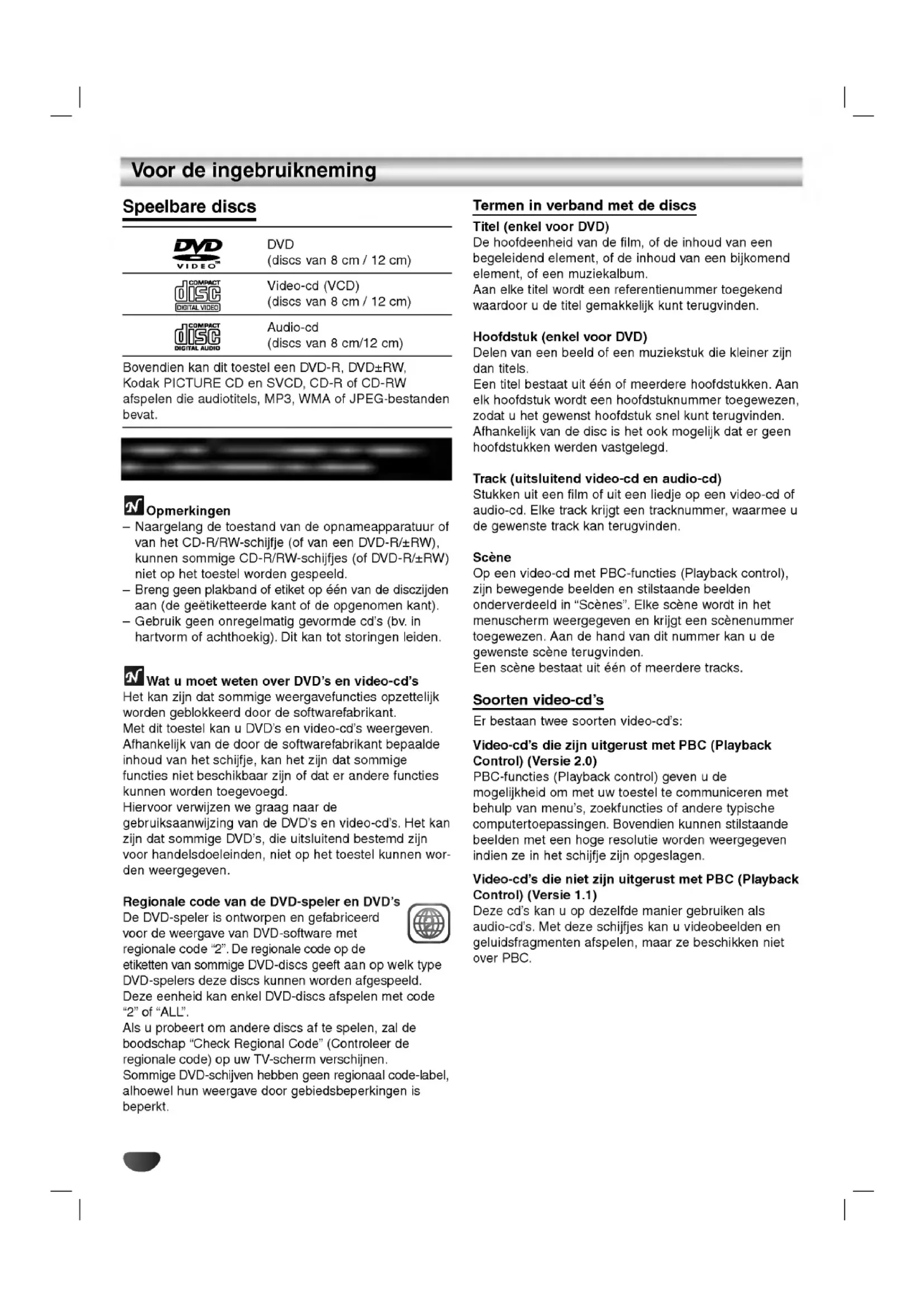 een vande disczijden aan (de geetiketteerde kantofde opgenomen kant). --Gebruik geen onregelmatig gevormde cd's (bv. inhartvormof achthoekig). Ditkan tot storingen leiden.Watu moet weten overDVD'senvideo-cd'sHetkan zijn dat sommige weergavefuncties opzettelijk worden geblokkeerd doordesoftwarefabrikant.MetdittoestelkanuDVD'senvideo-cd's weergeven. Afhankelijk vandedoordesoftwarefabrikant bepaalde inhoudvanhet schijfje, kanhet zijn dat sommige functiesnietbeschikbaar zijn ofdateranderefunctieskunnenworden toegevoegd. Hiervoor verwijzen graag naarde gebruiksaanwijzing vandeDVD'senvideo-cd's.Het kan zijn dat sommige DVD's,dieuitsluitendbestemd zijn voorhandelsdoeleinden,niet hettoestelkunnenwor-den weergegeven. Regionale codevande DVD-speler enDVD'sDe DVD-speler isontworpenen gefabriceerd voorde weergave vanDVD-software met regionale code"2".De regionale code deetikettenvan sommige DVD-discs geeft aan welktype DVD-spelers dezediscskunnenworden afgespeeld. DezeeenheidkanenkelDVD-discs afspelen met code"2"of"ALL".Alsu probeert omanderediscsaf