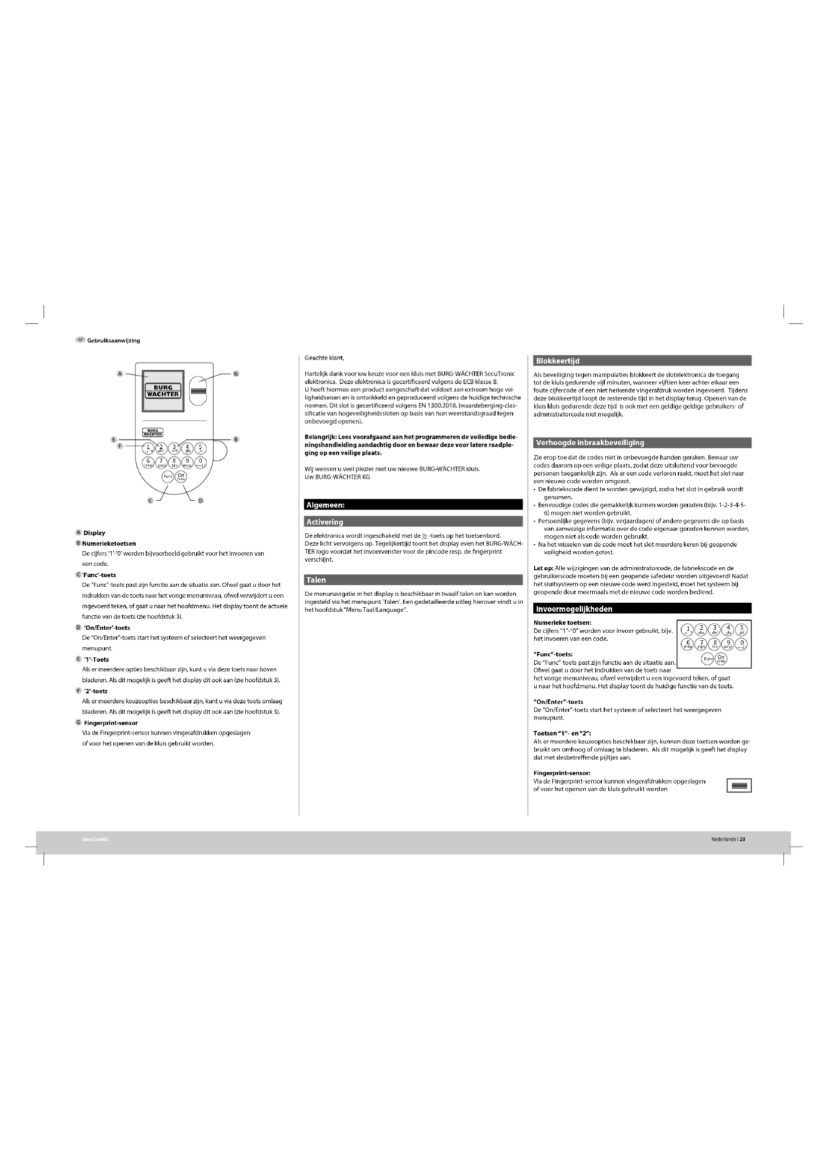 Hartelfiek Dank voor uw keze voor een kluis met BURG-WACHTER SecuTronic elektronica. Deze elektronica is gecertificerd volgen de ECB klasse B. U heb hiermee een producta aangestafst dovdoet aan extrem hoge veilgeleidensen en istwikkeln en geproducede volgenes de huigide technische nomien. Ditslot is gecertificerd volgen EN 1300:2018. (waardeberg-classificatie van hogeveilgeleidssloten op basis van hun waerstandsgraad toen integboevegod openen).