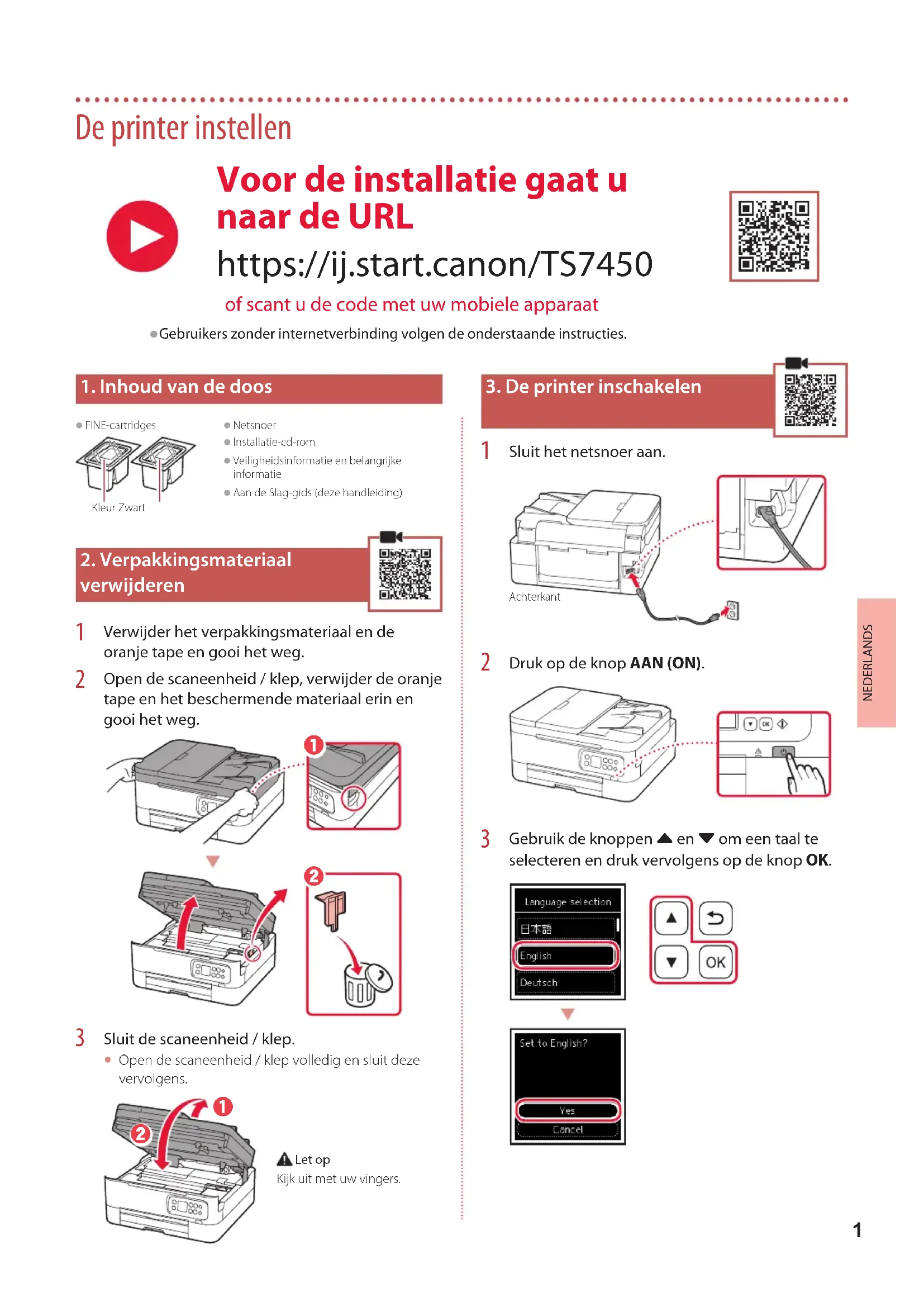 Gebruik de knoppen { en } om een taal te selecteren en druk vervolgens op de knop OK. Voor de installatie gaat u naar de URL https://ij.start.canon/TS7450 of scant u de code met uw mobiele apparaat