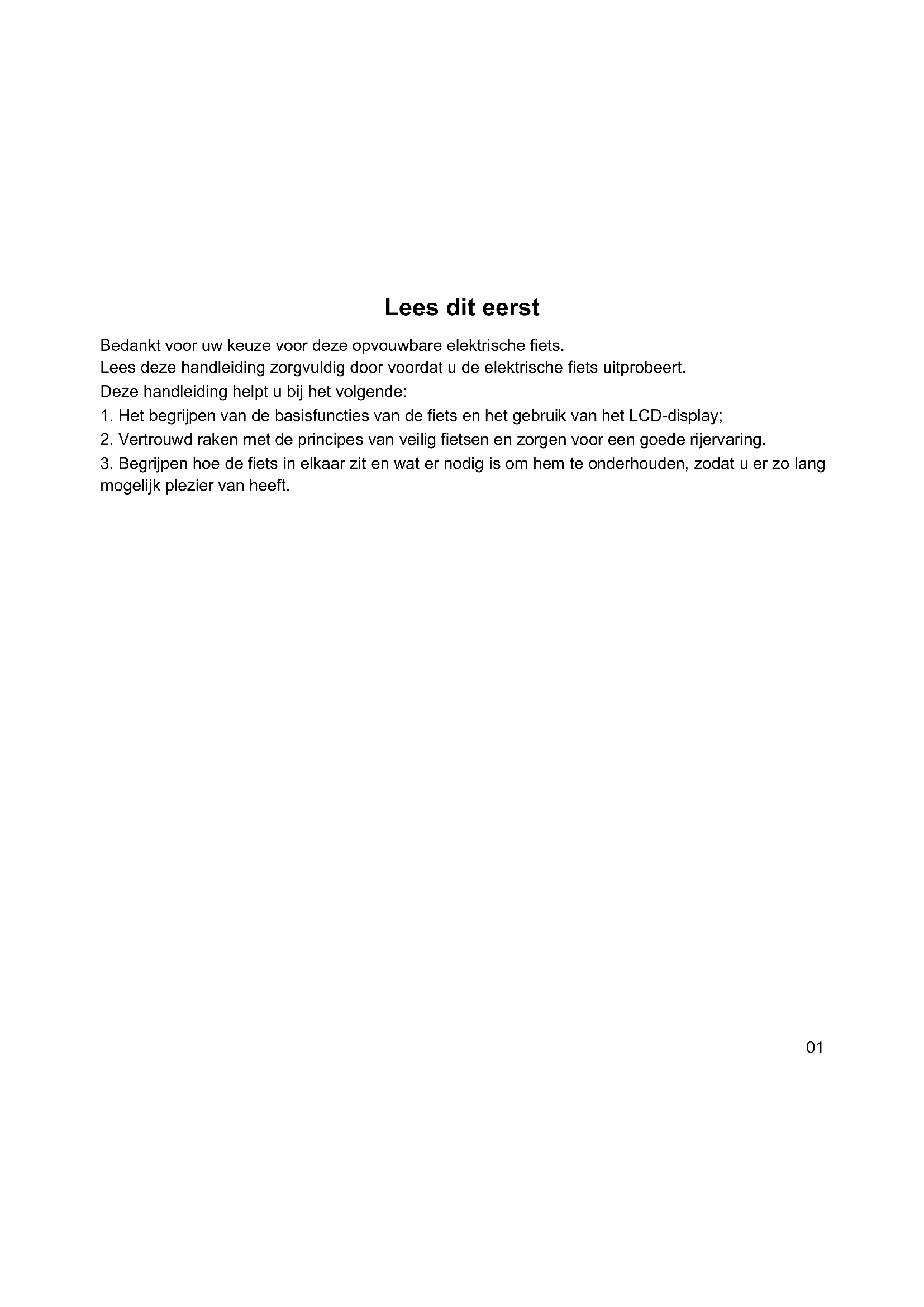 Gebruikershandleiding voor de X200BL/OR Elektrische vouwfiets01 Lees dit eerst Bedankt voor uw keuze voor deze opvouwbare elektrische fiets. Lees deze handleiding zorgvuldig door voordat u de elektrische fiets uitprobeert. Deze handleiding helpt u bij het volgende: