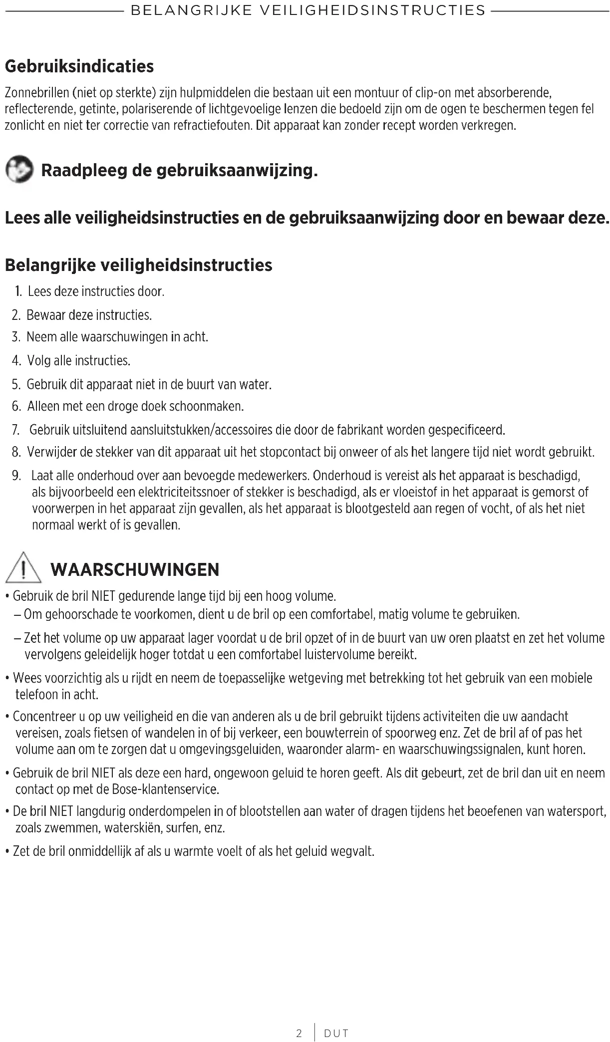 - Gebruik de bril NIET als deze een hard, ongewoon geluid te horen geeft. Als dit gebeurt, zet de bril dan uit en neem contact op met de Bose-klantenservice.