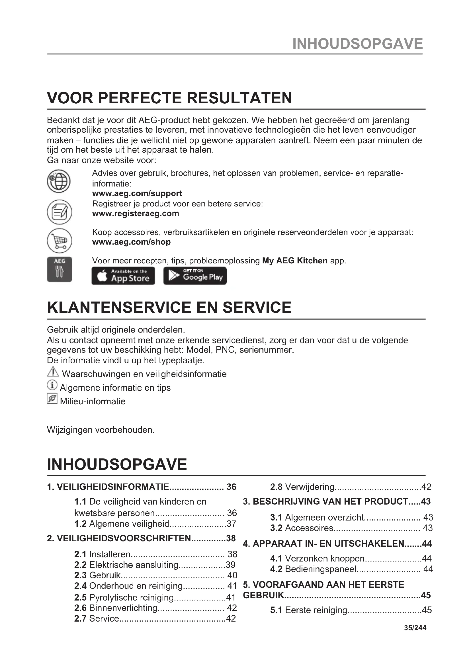 Bedankt dat je voor dit AEG-product hebt gekozen. We hebben het gecreëerd om jarenlang onberispelijke prestaties te leveren, met innovatieve technologieën die het leven eenvoudiger maken – functies die je wellicht niet op gewone apparaten aantreft. Neem een paar minuten de tijd om het beste uit het apparaat te halen. Ga naar onze website voor: Advies over gebruik, brochures, het oplossen van problemen, service- en reparatie- informatie: www.aeg.com/support Registreer je product voor een betere service: www.registeraeg.com Koop accessoires, verbruiksartikelen en originele reserveonderdelen voor je apparaat: www.aeg.com/shop Voor meer recepten, tips, probleemoplossing My AEG Kitchen app.