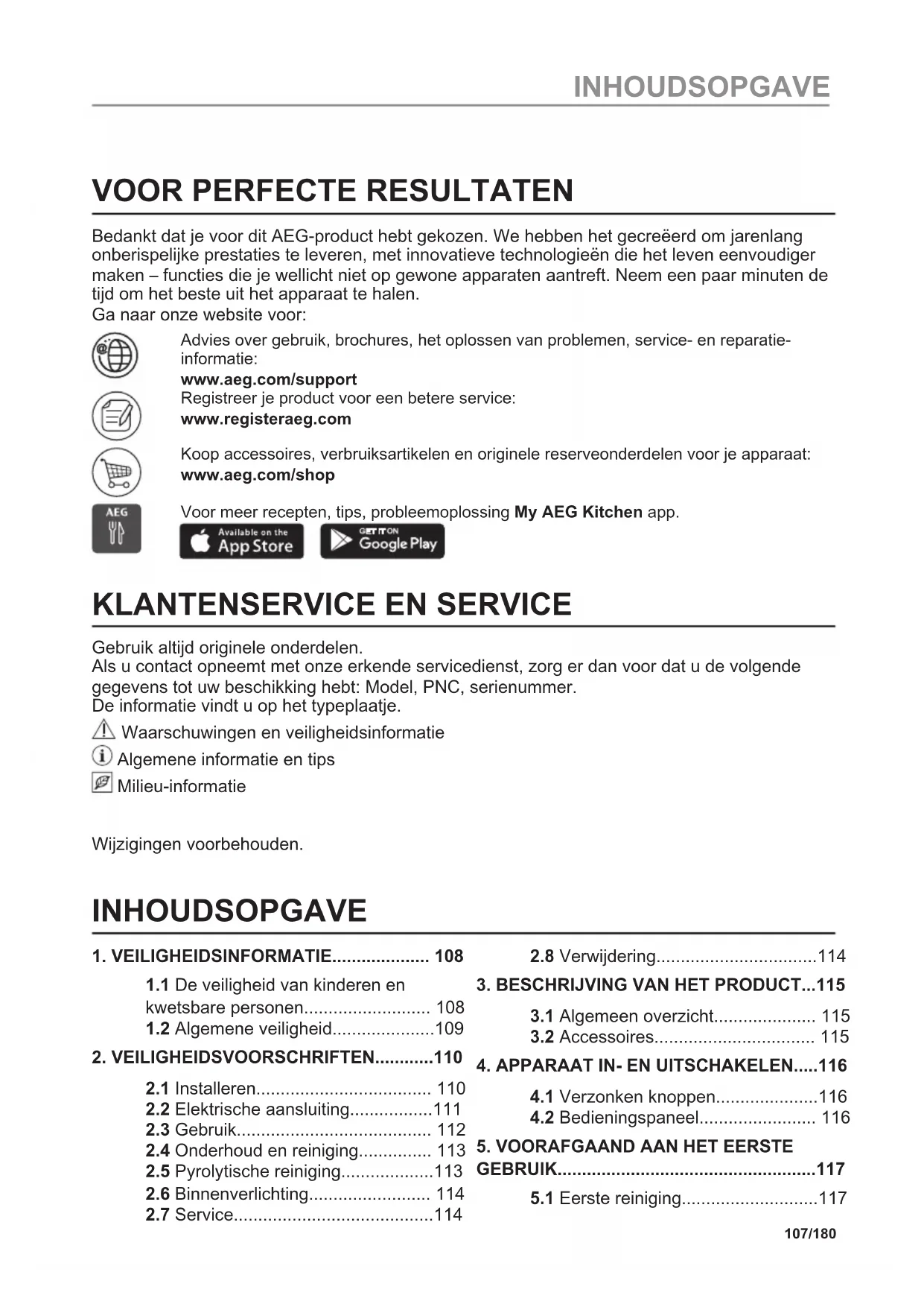 Bedankt dat je voor dit AEG-product hebt gekozen. We hebben het gecreëerd om jarenlang onberispelijke prestaties te leveren, met innovatieve technologieën die het leven eenvoudiger maken – functies die je wellicht niet op gewone apparaten aantreft. Neem een paar minuten de tijd om het beste uit het apparaat te halen. Ga naar onze website voor: Advies over gebruik, brochures, het oplossen van problemen, service- en reparatie- informatie: www.aeg.com/support Registreer je product voor een betere service: www.registeraeg.com Koop accessoires, verbruiksartikelen en originele reserveonderdelen voor je apparaat: www.aeg.com/shop Voor meer recepten, tips, probleemoplossing My AEG Kitchen app.