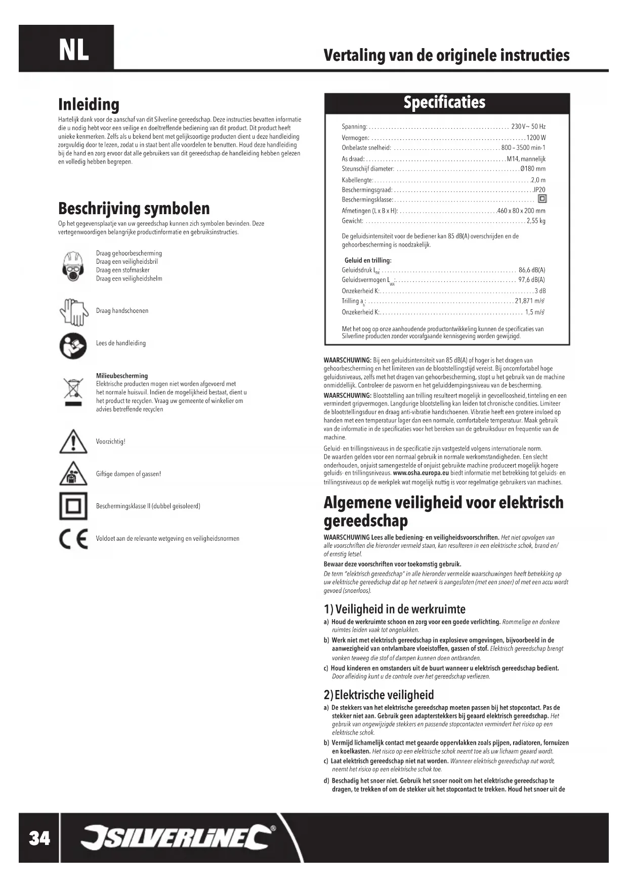 a) De stekkers van het elektrische gereedschap moeten passen bij het stopcontact. Pas de stekker niet aan. Gebruik geen adapterstekkers bij geaard elektrisch gereedschap. Het gebruik van ongewijzigde stekkers en passende stopcontacten vermindert het risico op een elektrische schok.b) Vermijd lichamelijk contact met geaarde oppervlakken zoals pijpen, radiatoren, fornuizen en koelkasten. Het risico op een elektrische schok neemt toe als uw lichaam geaard wordt.c) Laat elektrisch gereedschap niet nat worden. Wanneer elektrisch gereedschap nat wordt, neemt het risico op een elektrische schok toe.d) Beschadig het snoer niet. Gebruik het snoer nooit om het elektrische gereedschap te dragen, te trekken of om de stekker uit het stopcontact te trekken. Houd het snoer uit de Vertaling van de originele instructies Beschrijving symbolen Ophetgegevensplaatjevanuwgereedschapkunnenzichsymbolenbevinden.Dezevertegenwoordigenbelangrijkeproductinformatieengebruiksinstructies.Draag gehoorbescherming Draag een veiligheidsbril DraageenstofmaskerDraag een veiligheidshelmDraag handschoenenLees de handleidingMilieubescherming Elektrischeproductenmogennietwordenafgevoerdmet hetnormalehuisvuil.Indiendemogelijkheidbestaat,dientu hetproductterecyclen.Vraaguwgemeenteofwinkelierom advies betreffende recyclenVoorzichtig!Giftige dampen of gassen!BeschermingsklasseII(dubbelgeïsoleerd)Voldoetaanderelevantewetgevingenveiligheidsnormen Inleiding HartelijkdankvoordeaanschafvanditSilverlinegereedschap.Dezeinstructiesbevatteninformatiedie u nodig hebt voor een veilige en doeltreffende bediening van dit product. Dit product heeft uniekekenmerken.Zelfsalsubekendbentmetgelijksoortigeproductendientudezehandleidingzorgvuldig door te lezen, zodat u in staat bent alle voordelen te benutten. Houd deze handleiding bijdehandenzorgervoordatallegebruikersvanditgereedschapdehandleidinghebbengelezenen volledig hebben begrepen.