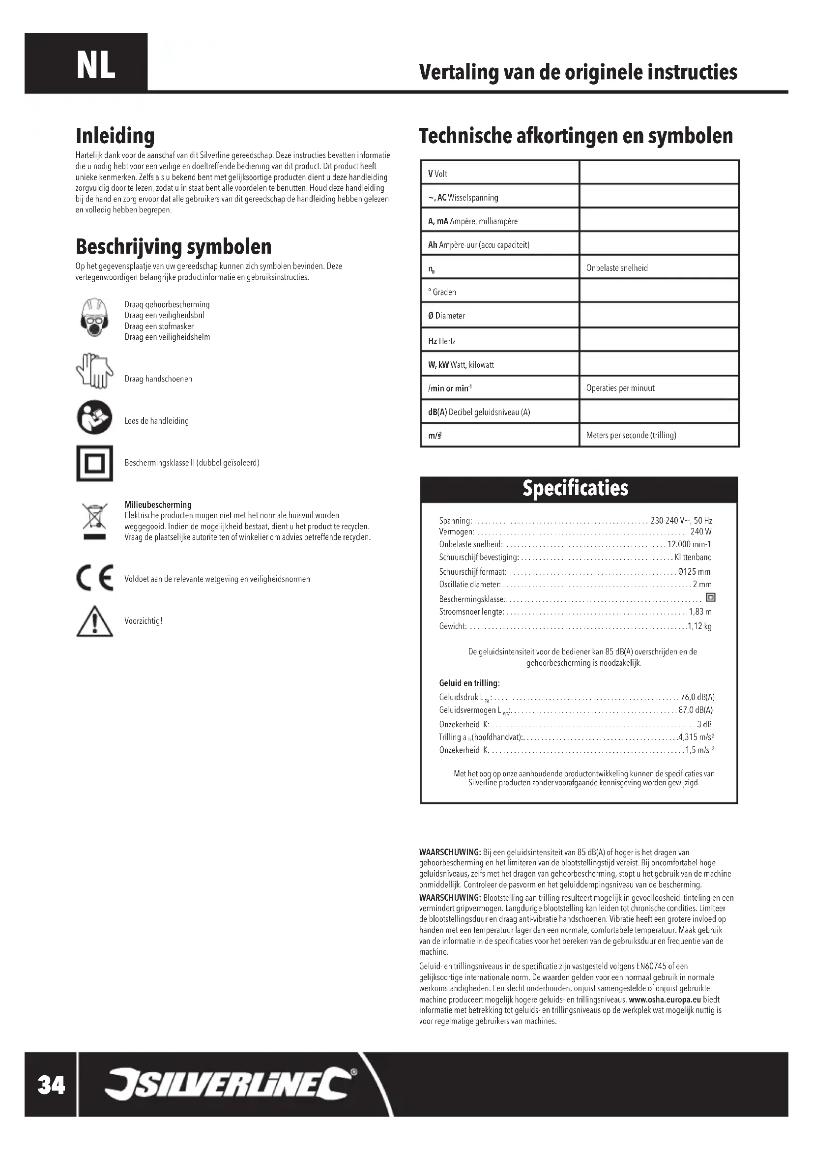 Methetoogoponzeaanhoudendeproductontwikkelingkunnendespecicatiesvan Silverlineproductenzondervoorafgaandekennisgevingwordengewijzigd. Inleiding HartelijkdankvoordeaanschafvanditSilverlinegereedschap.Dezeinstructiesbevatteninformatie die u nodig hebt voor een veilige en doeltreffende bediening van dit product. Dit product heeft uniekekenmerken.Zelfsalsubekendbentmetgelijksoortigeproductendientudezehandleiding zorgvuldig door te lezen, zodat u in staat bent alle voordelen te benutten. Houd deze handleiding bijdehandenzorgervoordatallegebruikersvanditgereedschapdehandleidinghebbengelezen en volledig hebben begrepen. Specicaties Beschrijving symbolen Ophetgegevensplaatjevanuwgereedschapkunnenzichsymbolenbevinden.Deze vertegenwoordigenbelangrijkeproductinformatieengebruiksinstructies. Draag gehoorbescherming Draag een veiligheidsbril Draageenstofmasker Draag een veiligheidshelm Draag handschoenen Lees de handleiding BeschermingsklasseII(dubbelgeïsoleerd) Milieubescherming Elektrischeproductenmogennietmethetnormalehuisvuilworden weggegooid.Indiendemogelijkheidbestaat,dientuhetproductterecyclen. Vraagdeplaatselijkeautoriteitenofwinkelieromadviesbetreffenderecyclen. Voldoetaanderelevantewetgevingenveiligheidsnormen Voorzichtig! 870944/951405_Manual.indd 34 04/07/2019 11:03240 W excentrische schuurmachine