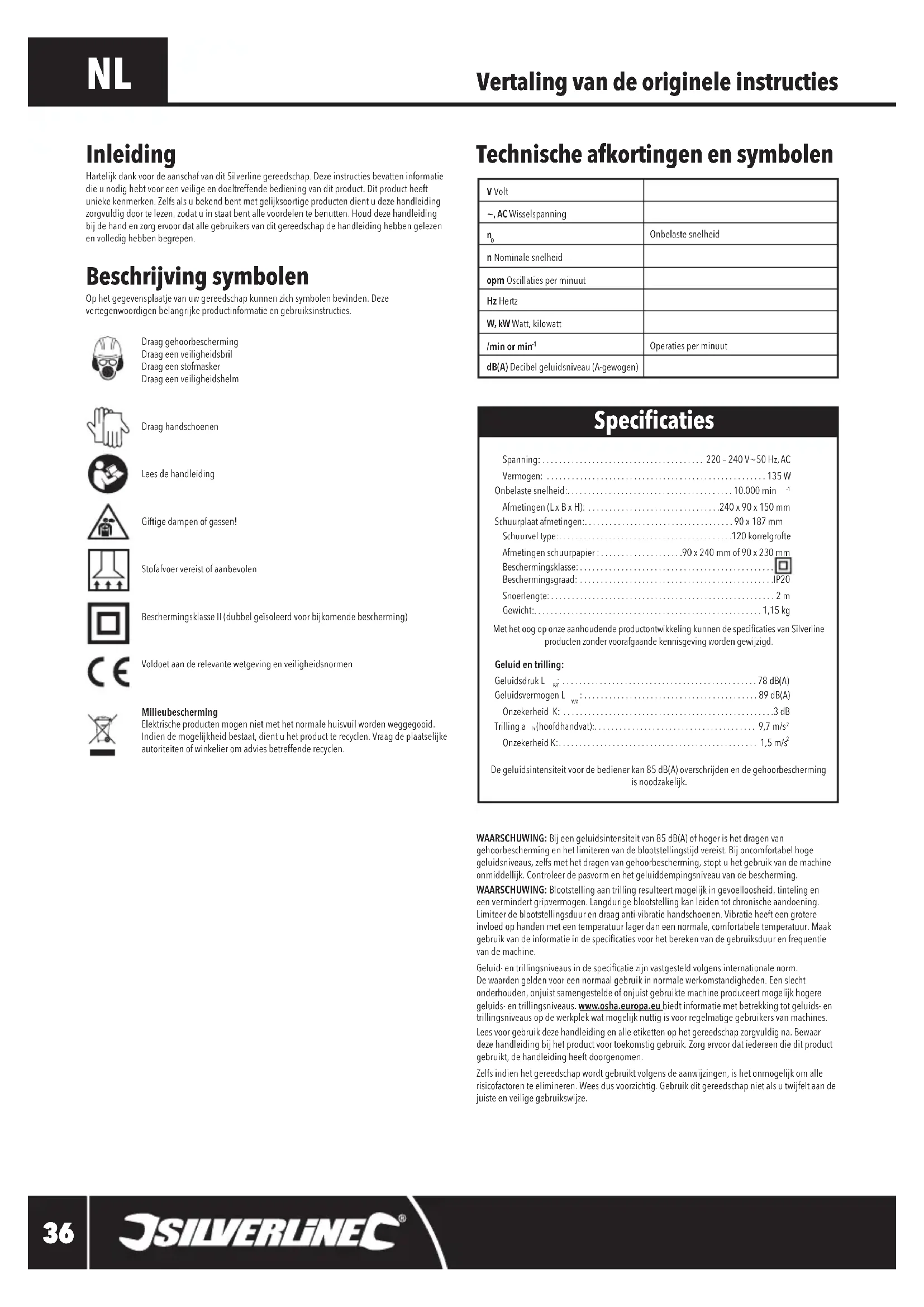 De geluidsintensiteit voor de bediener kan 85 dB(A) overschrijden en de gehoorbescherming is noodzakelijk. Inleiding Hartelijk dank voor de aanschaf van dit Silverline gereedschap. Deze instructies bevatten informatie die u nodig hebt voor een veilige en doeltreffende bediening van dit product. Dit product heeft unieke kenmerken. Zelfs als u bekend bent met gelijksoortige producten dient u deze handleiding zorgvuldig door te lezen, zodat u in staat bent alle voordelen te benutten. Houd deze handleiding bij de hand en zorg ervoor dat alle gebruikers van dit gereedschap de handleiding hebben gelezen en volledig hebben begrepen. Specicaties V Volt~, AC Wisselspanning