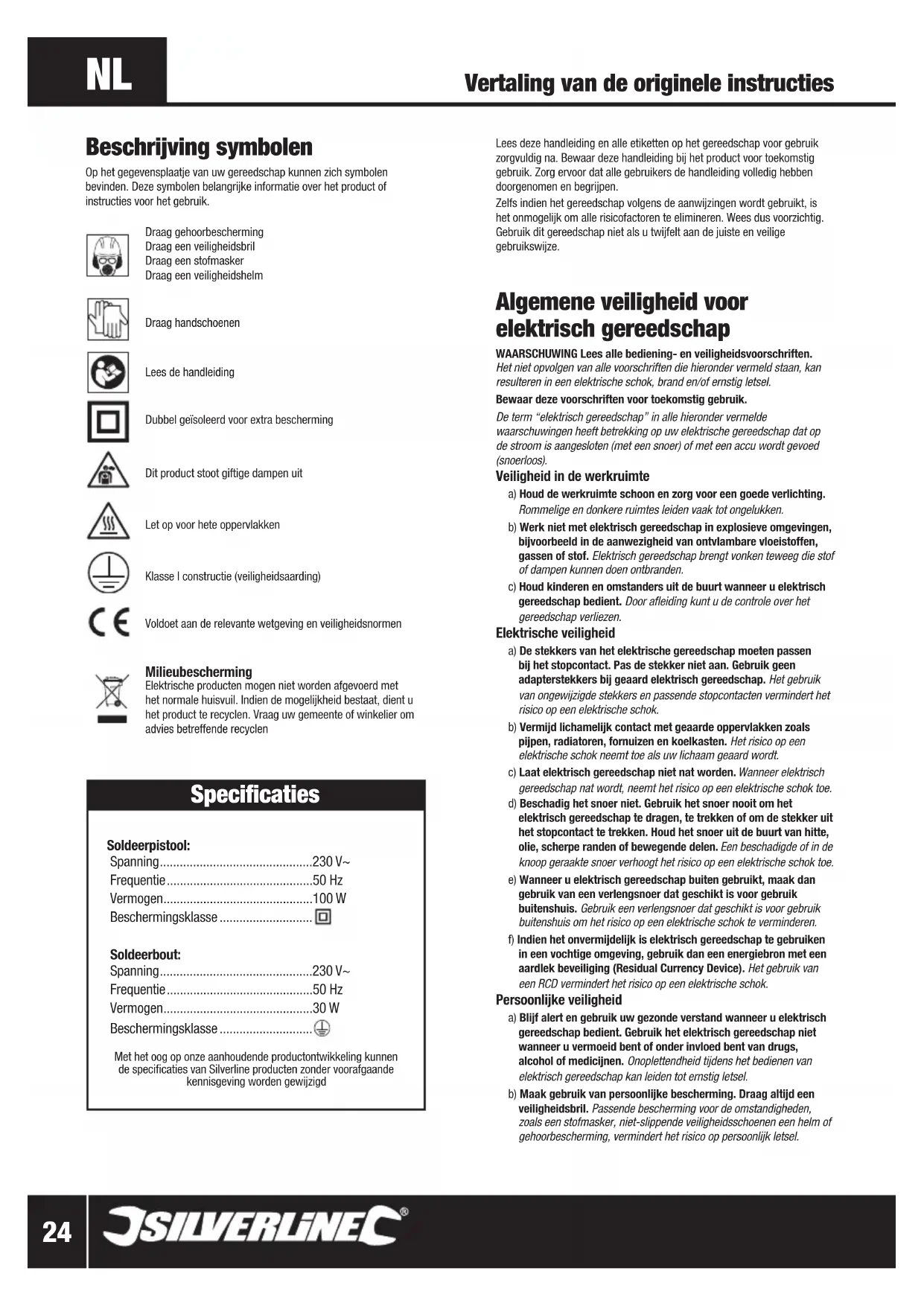 Lees deze handleiding en alle etiketten op het gereedschap voor gebruik zorgvuldig na. Bewaar deze handleiding bij het product voor toekomstig gebruik. Zorg ervoor dat alle gebruikers de handleiding volledig hebben doorgenomen en begrijpen. Zelfs indien het gereedschap volgens de aanwijzingen wordt gebruikt, is het onmogelijk om alle risicofactoren te elimineren. Wees dus voorzichtig. Gebruik dit gereedschap niet als u twijfelt aan de juiste en veilige gebruikswijze. Algemene veiligheid voor elektrisch gereedschap WAARSCHUWING Lees alle bediening- en veiligheidsvoorschriften. Het niet opvolgen van alle voorschriften die hieronder vermeld staan, kan resulteren in een elektrische schok, brand en/of ernstig letsel. Bewaar deze voorschriften voor toekomstig gebruik. De term “elektrisch gereedschap” in alle hieronder vermelde waarschuwingen heeft betrekking op uw elektrische gereedschap dat op de stroom is aangesloten (met een snoer) of met een accu wordt gevoed (snoerloos). Veiligheid in de werkruimte a) Houd de werkruimte schoon en zorg voor een goede verlichting. Rommelige en donkere ruimtes leiden vaak tot ongelukken. b) Werk niet met elektrisch gereedschap in explosieve omgevingen, bijvoorbeeld in de aanwezigheid van ontvlambare vloeistoffen, gassen of stof. Elektrisch gereedschap brengt vonken teweeg die stof of dampen kunnen doen ontbranden. c) Houd kinderen en omstanders uit de buurt wanneer u elektrisch gereedschap bedient. Door afleiding kunt u de controle over het gereedschap verliezen. Elektrische veiligheid a) De stekkers van het elektrische gereedschap moeten passen bij het stopcontact. Pas de stekker niet aan. Gebruik geen adapterstekkers bij geaard elektrisch gereedschap. Het gebruik van ongewijzigde stekkers en passende stopcontacten vermindert het risico op een elektrische schok. b) Vermijd lichamelijk contact met geaarde oppervlakken zoals pijpen, radiatoren, fornuizen en koelkasten. Het risico op een elektrische schok neemt toe als uw lichaam geaard wordt. c) Laat elektrisch gereedschap niet nat worden. Wanneer elektrisch gereedschap nat wordt, neemt het risico op een elektrische schok toe. d) Beschadig het snoer niet. Gebruik het snoer nooit om het elektrisch gereedschap te dragen, te trekken of om de stekker uit het stopcontact te trekken. Houd het snoer uit de buurt van hitte, olie, scherpe randen of bewegende delen. Een beschadigde of in de knoop geraakte snoer verhoogt het risico op een elektrische schok toe. e) Wanneer u elektrisch gereedschap buiten gebruikt, maak dan gebruik van een verlengsnoer dat geschikt is voor gebruik buitenshuis. Gebruik een verlengsnoer dat geschikt is voor gebruik buitenshuis om het risico op een elektrische schok te verminderen. f) Indien het onvermijdelijk is elektrisch gereedschap te gebruiken in een vochtige omgeving, gebruik dan een energiebron met een aardlek beveiliging (Residual Currency Device). Het gebruik van een RCD vermindert het risico op een elektrische schok. Persoonlijke veiligheid a) Blijf alert en gebruik uw gezonde verstand wanneer u elektrisch gereedschap bedient. Gebruik het elektrisch gereedschap niet wanneer u vermoeid bent of onder invloed bent van drugs, alcohol of medicijnen. Onoplettendheid tijdens het bedienen van elektrisch gereedschap kan leiden tot ernstig letsel. b) Maak gebruik van persoonlijke bescherming. Draag altijd een veiligheidsbril. Passende bescherming voor de omstandigheden, zoals een stofmasker, niet-slippende veiligheidsschoenen een helm of gehoorbescherming, vermindert het risico op persoonlijk letsel. Beschrijving symbolen Op het gegevensplaatje van uw gereedschap kunnen zich symbolen bevinden. Deze symbolen belangrijke informatie over het product of instructies voor het gebruik. Draag gehoorbescherming Draag een veiligheidsbril Draag een stofmasker Draag een veiligheidshelm Draag handschoenen Lees de handleiding Dubbel geïsoleerd voor extra bescherming Dit product stoot giftige dampen uit Let op voor hete oppervlakken Klasse I constructie (veiligheidsaarding) Voldoet aan de relevante wetgeving en veiligheidsnormen Milieubescherming Elektrische producten mogen niet worden afgevoerd met het normale huisvuil. Indien de mogelijkheid bestaat, dient u het product te recyclen. Vraag uw gemeente of winkelier om advies betreffende recyclen Specificaties Soldeerpistool: Spanning ..............................................230 V~ Frequentie ............................................50 Hz Vermogen .............................................100 W Beschermingsklasse ............................ Soldeerbout: Spanning ..............................................230 V~ Frequentie ............................................50 Hz Vermogen .............................................30 W Beschermingsklasse ............................ Met het oog op onze aanhoudende productontwikkeling kunnen de specificaties van Silverline producten zonder voorafgaande kennisgeving worden gewijzigd Vertaling van de originele instructies 845318_Z1MANPRO1.indd 24 22/08/2016 15:41www.silverlinetools.com