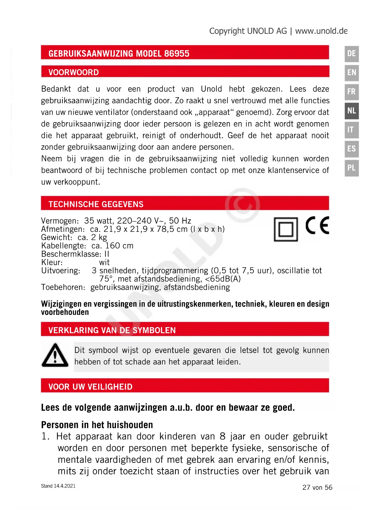 Dit symbool wijst op eventuele gevaren die letsel tot gevolg kunnen hebben of tot schade aan het apparaat leiden. VOORWOORD Bedankt dat u voor een product van Unold hebt gekozen. Lees deze gebruiksaanwijzing aandachtig door. Zo raakt u snel vertrouwd met alle functies van uw nieuwe ventilator (onderstaand ook „apparaat“ genoemd). Zorg ervoor dat de gebruiksaanwijzing door ieder persoon is gelezen en in acht wordt genomen die het apparaat gebruikt, reinigt of onderhoudt. Geef de het apparaat nooit zonder gebruiksaanwijzing door aan andere personen. Neem bij vragen die in de gebruiksaanwijzing niet volledig kunnen worden beantwoord of bij technische problemen contact op met onze klantenservice of uw verkooppunt. Copyright UNOLD AG | www.unold.de UNOLD ©28 von 56 Stand 14.4.2021