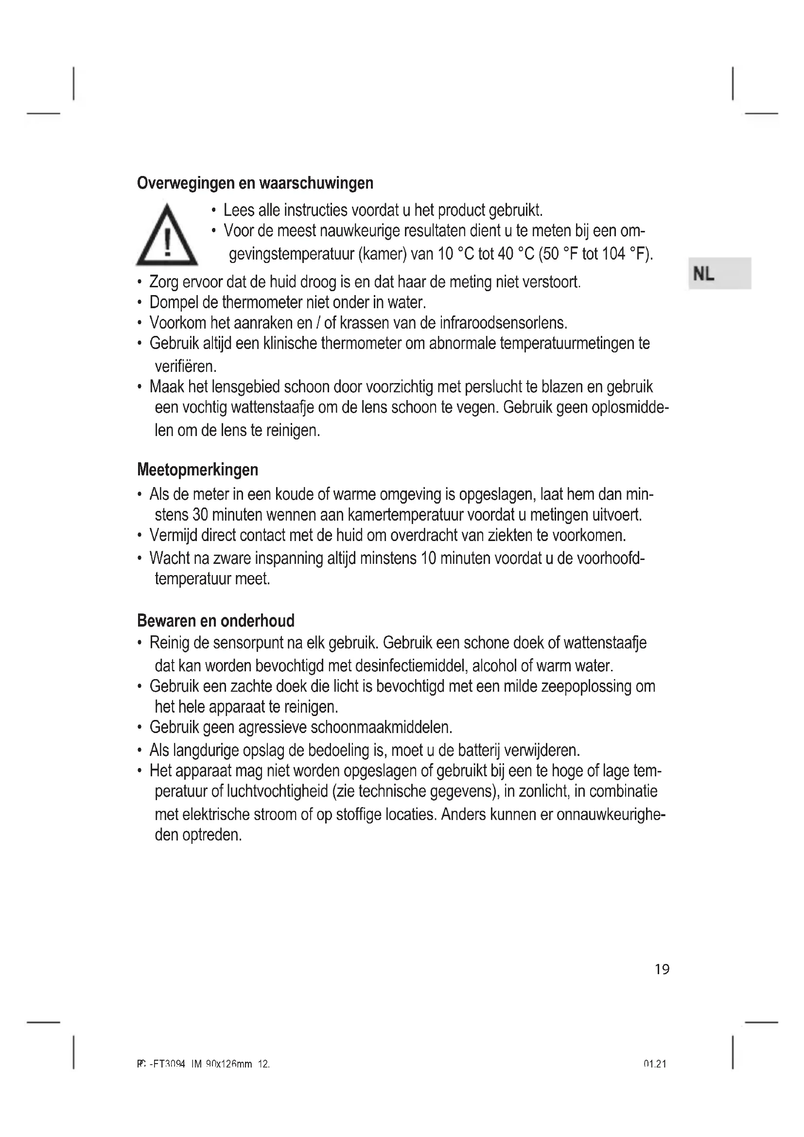 - Wacht na zware inspanning altijd minstens 10 minuten voordat u de voorhoofd- temperatuur meet. Bewaren en onderhoud