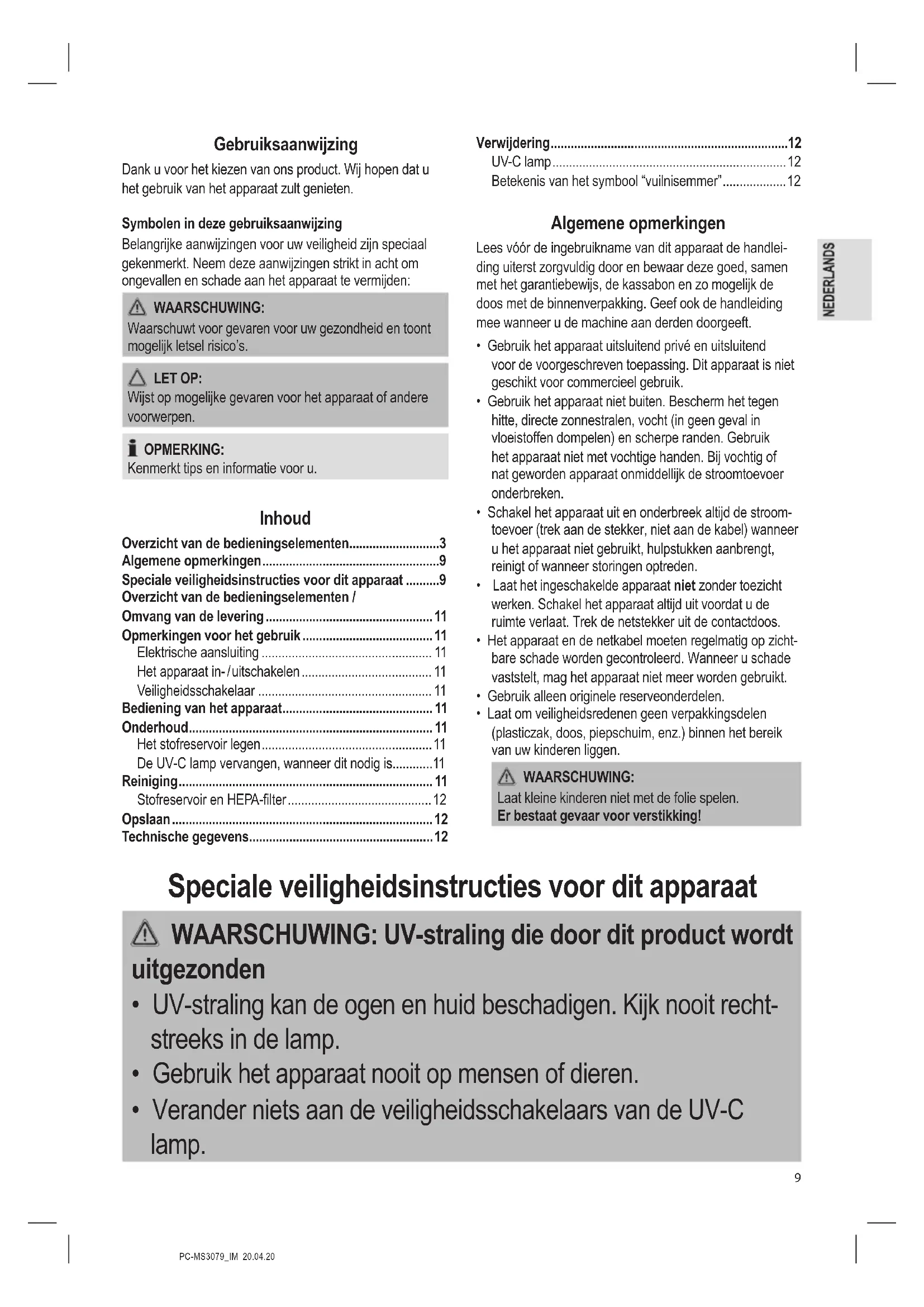 - Voordat u het apparaat reinigt, trekt u altijd eerst de stekker uit het stopcontact.PC-MS3079_IM 20.04.20
