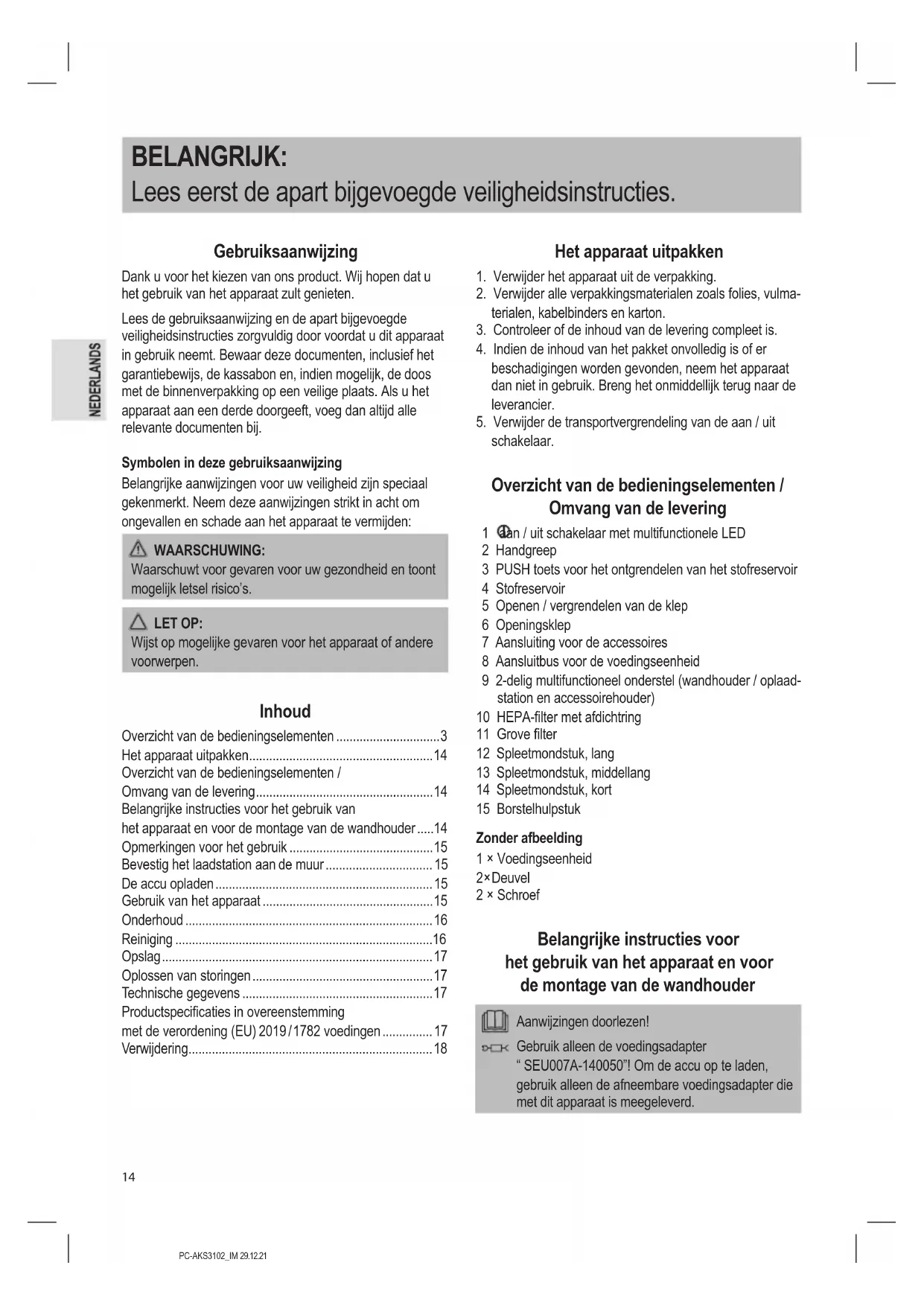 schakelaar. Overzicht van de bedieningselementen / Omvang van de levering 1 aan / uit schakelaar met multifunctionele LED 2 Handgreep 3 PUSH toets voor het ontgrendelen van het stofreservoir 4 Stofreservoir 5 Openen / vergrendelen van de klep 6 Openingsklep 7 Aansluiting voor de accessoires 8 Aansluitbus voor de voedingseenheid 9 2-delig multifunctioneel onderstel (wandhouder / oplaad- station en accessoirehouder) 10 HEPA-lter met afdichtring 11 Grove lter 12 Spleetmondstuk, lang 13 Spleetmondstuk, middellang 14 Spleetmondstuk, kort 15 Borstelhulpstuk Zonder afbeelding 1 × Voedingseenheid 2 × Deuvel 2 × Schroef Belangrijke instructies voor het gebruik van het apparaat en voor de montage van de wandhouder Aanwijzingen doorlezen! Gebruik alleen de voedingsadapter “ SEU007A-140050”! Om de accu op te laden, gebruik alleen de afneembare voedingsadapter die met dit apparaat is meegeleverd.PC-AKS3102_IM 29.12.21