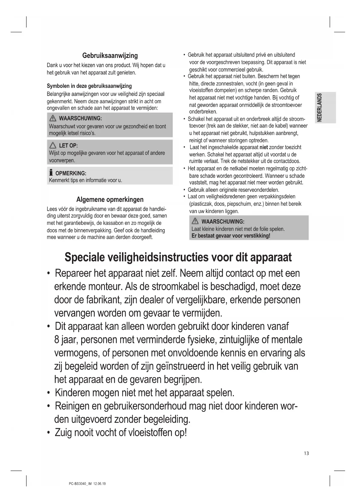 - Zuig nooit vocht of vloeistoffen op!PC-BS3040_IM 12.06.19