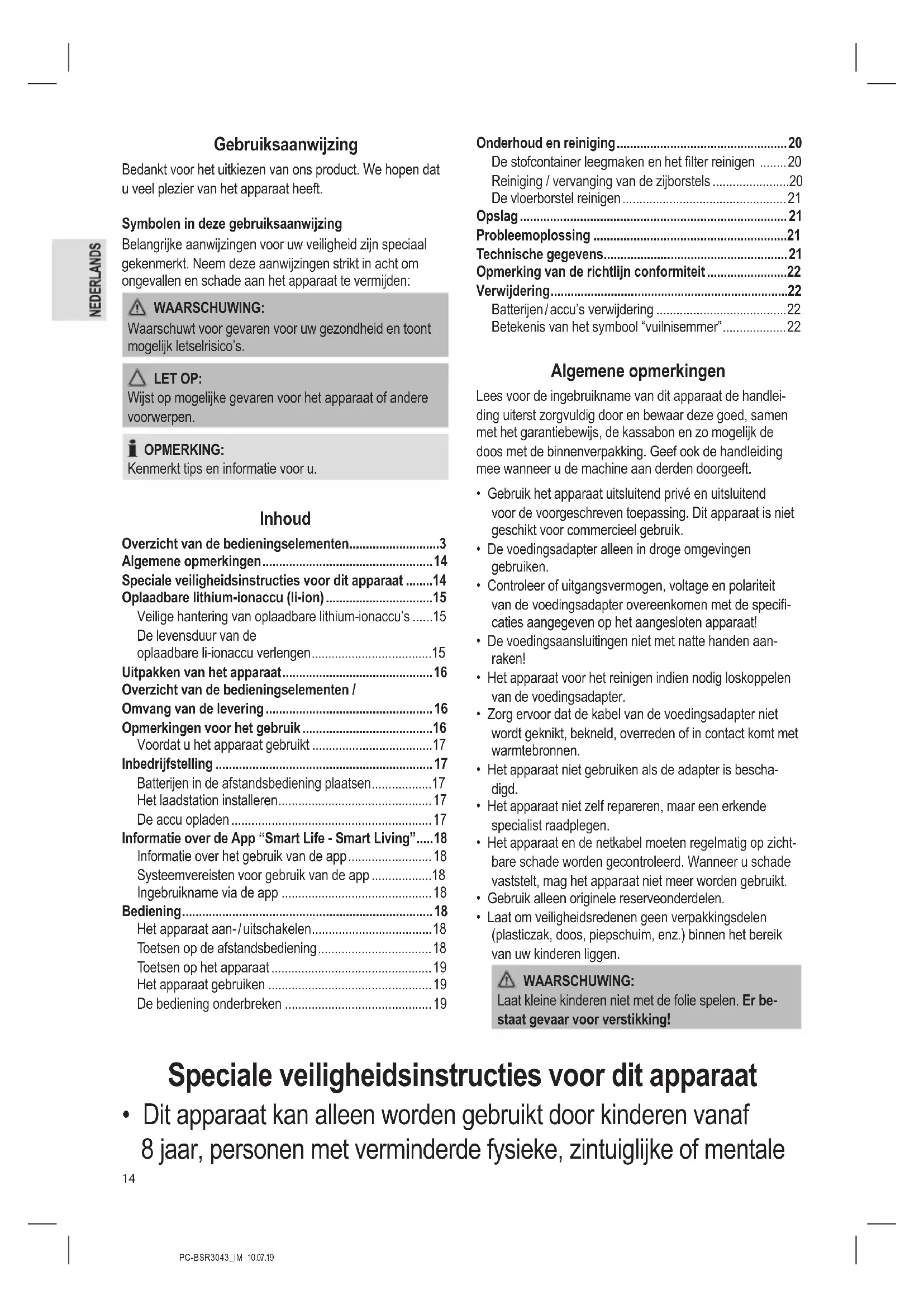 stekkerverbinding. Informatie over waar batterijen / accu’s kunnen worden afgevoerd kan bij uw gemeente worden verkregen. Betekenis van het symbool “vuilnisemmer” Bescherm ons milieu, elektrische apparaten horen niet in het huisafval. Maak voor het afvoeren van elektrische apparaten gebruik van de voorgeschreven verzamelpunten en geef daar de elektrische apparaten af die u niet meer gebruikt. Daardoor helpt u de potentiële effecten te voorkomen die een verkeerde afvoer op het milieu en de menselijke gezondheid kunnen hebben. Op deze wijze levert u uw bijdrage aan het hergebruik, de recycling en andere verwerkingsvormen voor oude elektro- nische en elektrische apparaten. Voor informatie over verzamelpunten voor uw apparaten kunt u contact opnemen met uw gemeente of gemeentead- ministratie.PC-BSR3043_IM 10.07.19