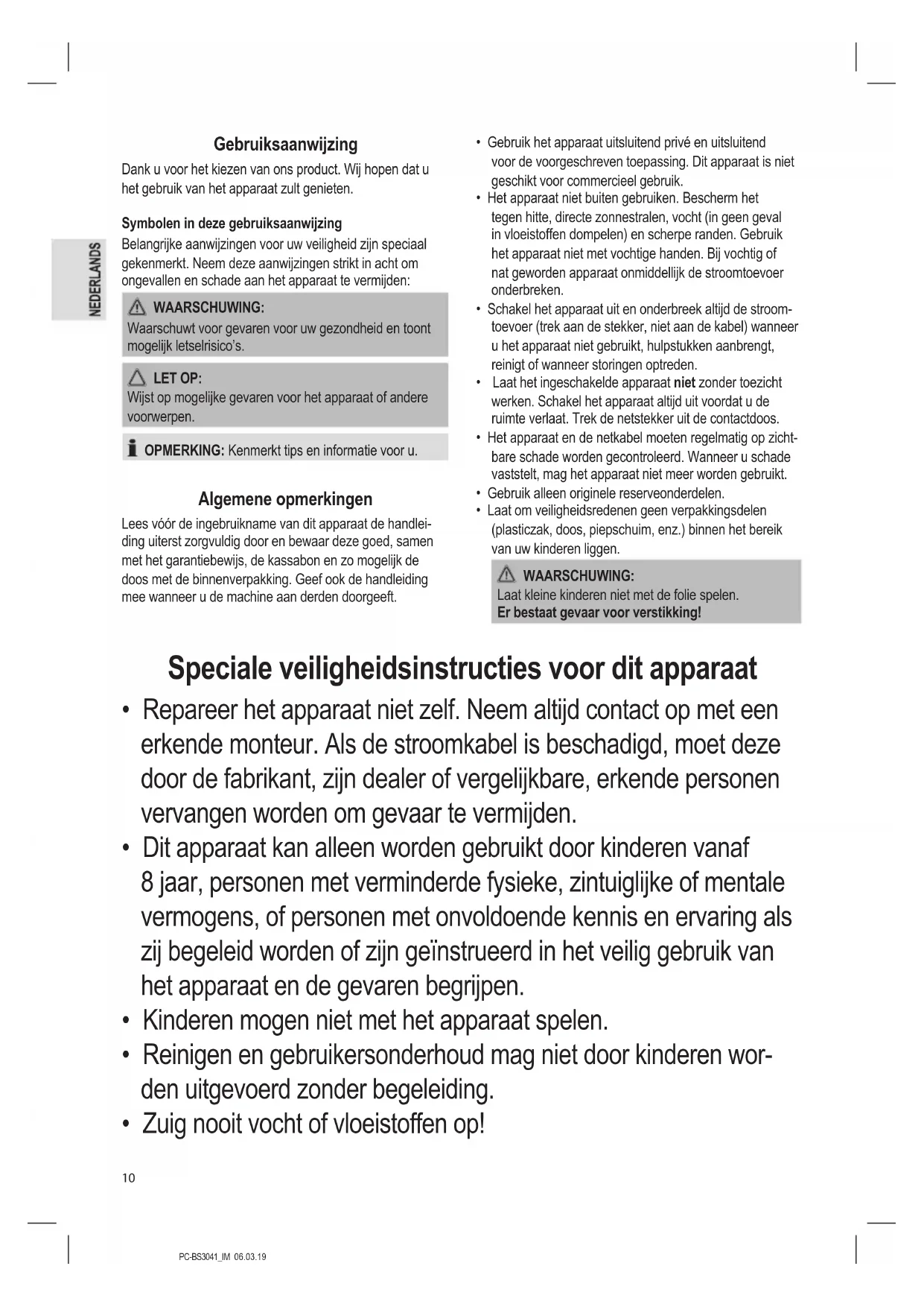 - Zuig nooit vocht of vloeistoffen op!PC-BS3041_IM 06.03.19